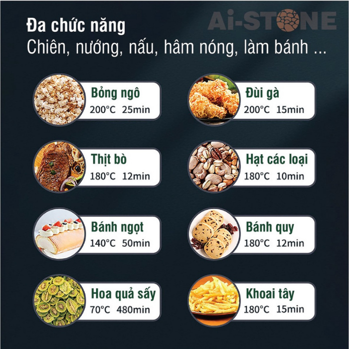 ✅Thỏa Sức Sáng Tạo Mọi Món Ngon Với 10 Chế Độ Nấu Sở hữu tới 10 chế độ nấu , nồi chiên không dầu Ai-STONE Ai-6800 12L thực sự có thể giúp bạn nấu cả thế giới Bạn có thể nướng thịt, làm khoai tây chiên, nướng gà, làm pizza, làm bánh, nướng cá, bít tết, nướng rau củ, nướng bánh mì…Khay chiên của chiếc nồi chiên không dầu Ai-STONE Ai-6800 12L này được thiết kế nhiều lỗ nhỏ giúp giảm tối đa lượng mỡ thừa có trong thức ăn.