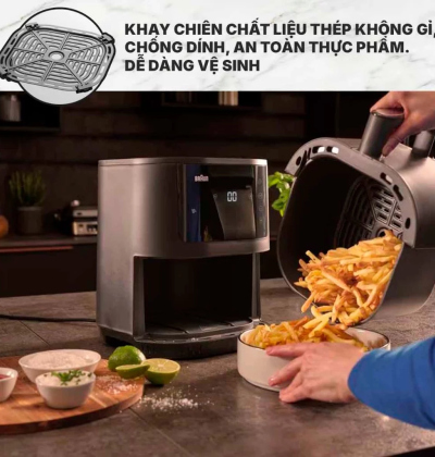 Nồi chiên Braun HF3030 trang bị bảng điều khiển điện tử hiện đại, dễ thao tác, cho phép điều chỉnh nhiệt độ và thời gian chính xác. Công nghệ Rapid Air giúp lưu thông không khí nóng mạnh, chiên nướng thực phẩm đều và giòn mà vẫn giữ được độ ẩm bên trong.