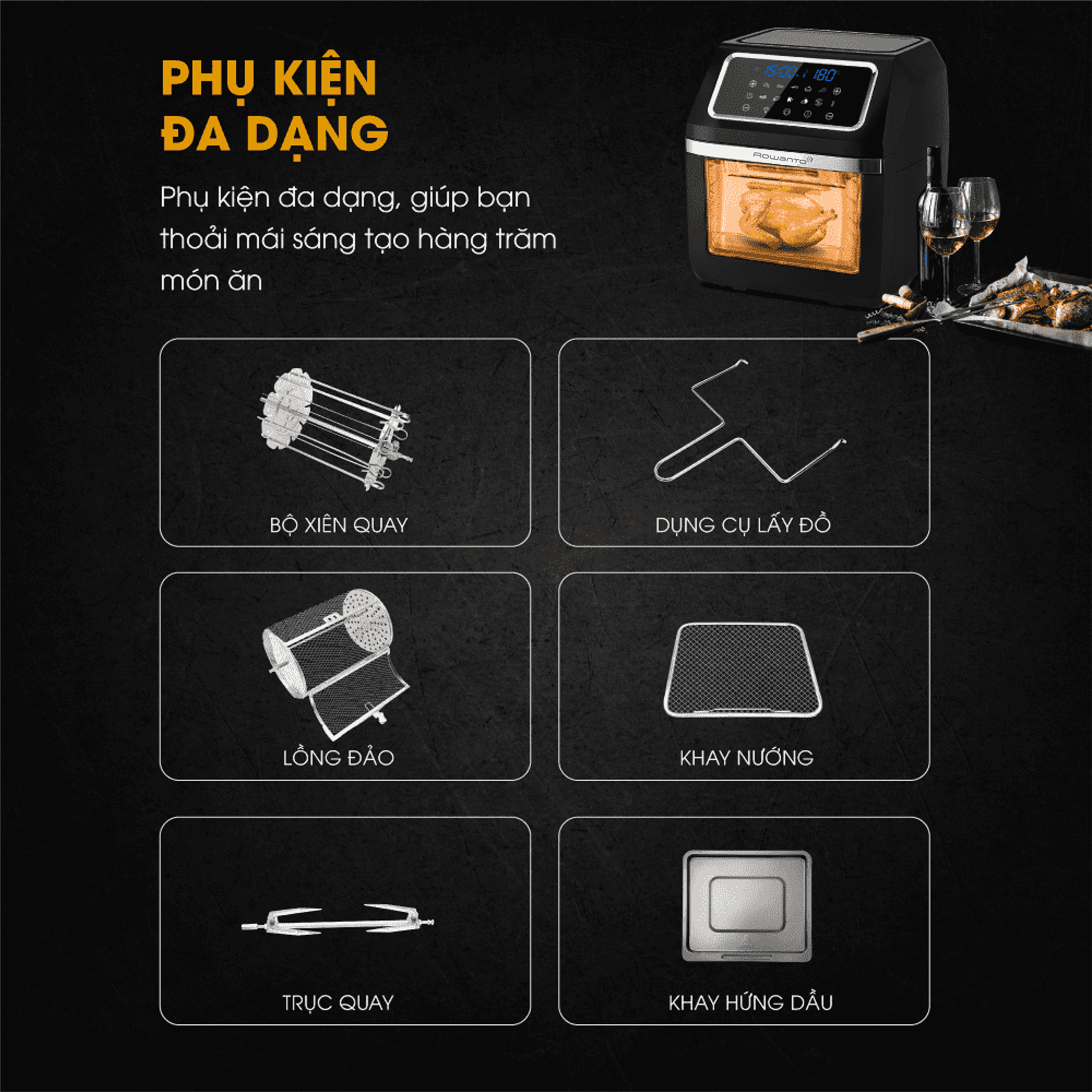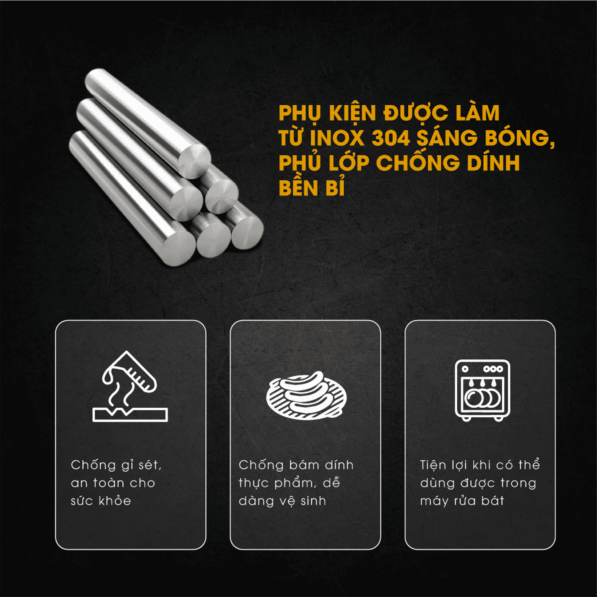 - Phụ kiện đa dạng, được làm tự INOX 304 sáng bóng, phủ lớp chống dính bền bỉ