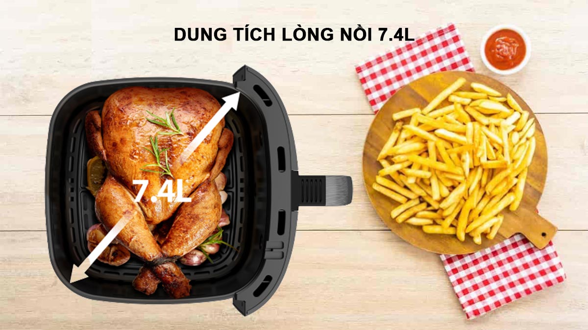 Với dung tích 7,4 lít, nồi dễ dàng chiên gà nguyên con khoảng 2,2kg, đáp ứng nhu cầu nấu nướng cho gia đình đông người. Công suất mạnh mẽ 1550–1850W kết hợp công nghệ Heat-Q giúp thực phẩm giòn rụm bên ngoài mà vẫn giữ độ mềm ngọt bên trong.
