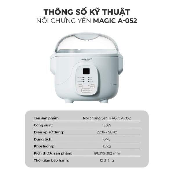 Nồi chưng yến Magic A-052 là giải pháp hoàn hảo cho những người yêu thích yến sào và các món dinh dưỡng. Với công suất 150W, nồi vận hành êm ái, nấu chậm giúp giữ trọn dưỡng chất và hương vị tự nhiên của tổ yến.