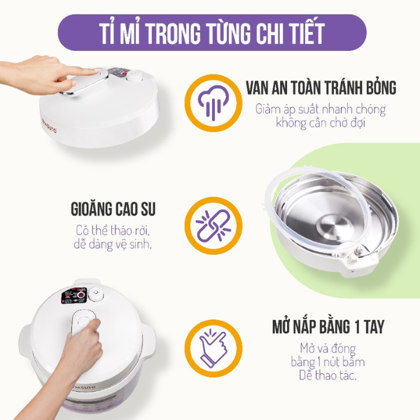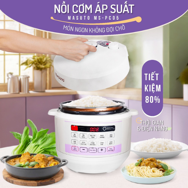 Nồi cơm áp suất đa năng Masuto MSPC05 là thế hệ nồi áp suất điện thông minh khắc phục mọi nhược điểm của các loại nồi truyền thống, mang đến cho bạn trải nghiệm nấu nướng tuyệt vời. Chiếc nồi đa năng có thể thay thế nhiều loại thiết bị nhà bếp với hơn 10 tính năng chế biến chuyên sâu được lập trình sẵn, đảm bảo sự tiện ích, an toàn khi sử dụng. Ngoài ra, nồi còn có chế độ nấu mở nắp riêng biệt, biến đổi linh hoạt trong quá trình nấu. Nấu ăn ngon, tiết kiệm thời gian, năng lượng, không bám mùi.