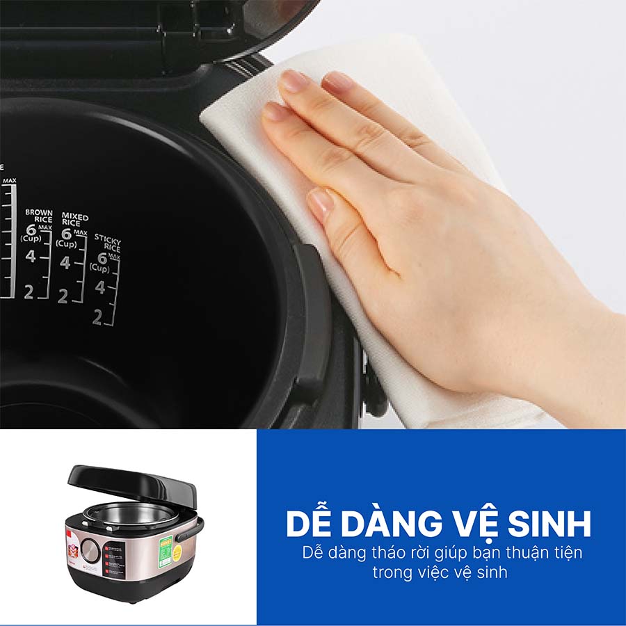 Bảng điều khiển cảm ứng hiện đại kết hợp màn hình LED trực quan giúp thao tác dễ dàng, phù hợp cho cả người lớn tuổi. Thiết kế tiện ích với nắp trong có thể tháo rời và van thoát hơi thông minh mang lại sự thuận tiện trong vệ sinh, đồng thời giữ cơm chín đều mà không bị đọng nước hay khô cứng.