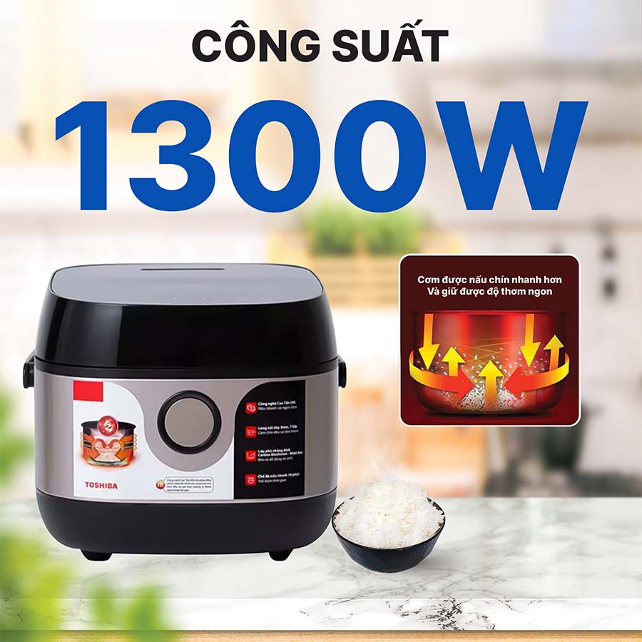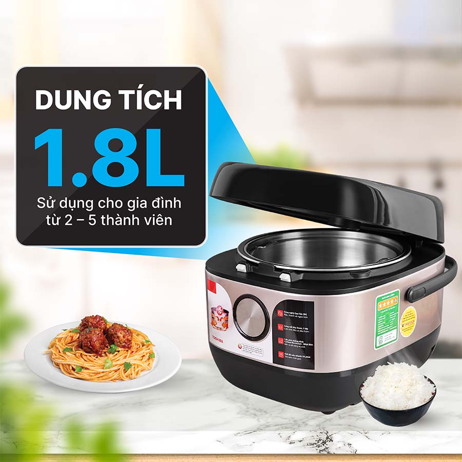 Nồi cơm điện cao tần Toshiba RC-18IX1PV 1.8L được thiết kế hiện đại với kiểu dáng gọn gàng, màu sắc sang trọng, phù hợp với nhiều không gian bếp gia đình. Với kích thước 367 × 290 × 249 mm và trọng lượng khoảng 4,9 kg, sản phẩm không chiếm nhiều diện tích nhưng vẫn chắc chắn và tiện lợi trong quá trình sử dụng.