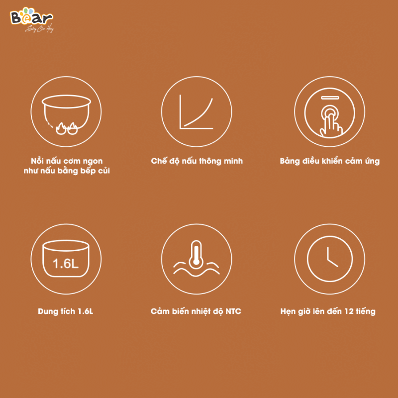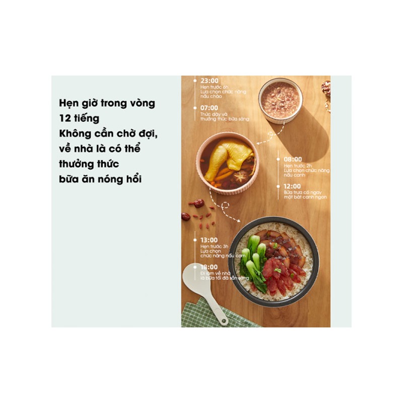 – Hẹn giờ linh hoạt: Với nồi cơm điện Bear, bạn chỉ cần nhấn nút “Đặt giờ”, đi làm cả buổi mà vẫn có thể thưởng thức món ăn nóng hổi, không cần phải chờ đợi. Ví dụ như vào buổi tối hôm trước, bạn đặt giờ nấu cháo là 7 giờ sáng hôm sau, khi thức dậy bạn đã có thể thưởng thức bữa sáng đầy đủ dinh dưỡng. Hoặc bạn có thể đặt giờ nấu canh là 8 giờ sáng, và khi đến 12 giờ trưa, bạn đã có ngay bát canh thơm ngon để thưởng thức…