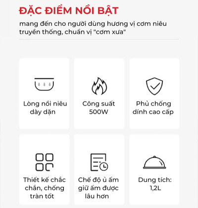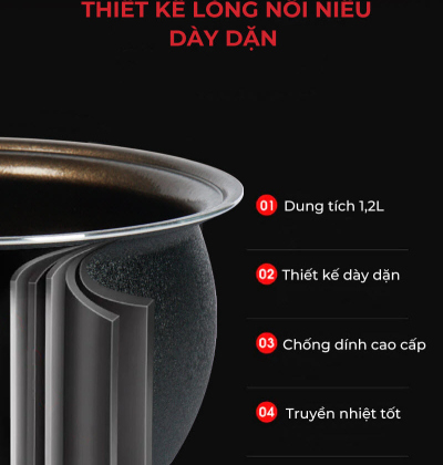 Lòng nồi niêu dày 2.0mm: Hợp kim nhôm phủ chống dính cao cấp, an toàn, giúp cơm chín đều, dẻo thơm.