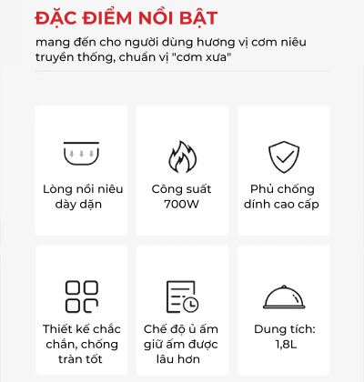 Lòng nồi niêu dày dặn: Hợp kim nhôm phủ chống dính cao cấp, an toàn, giúp cơm chín đều, dẻo thơm.