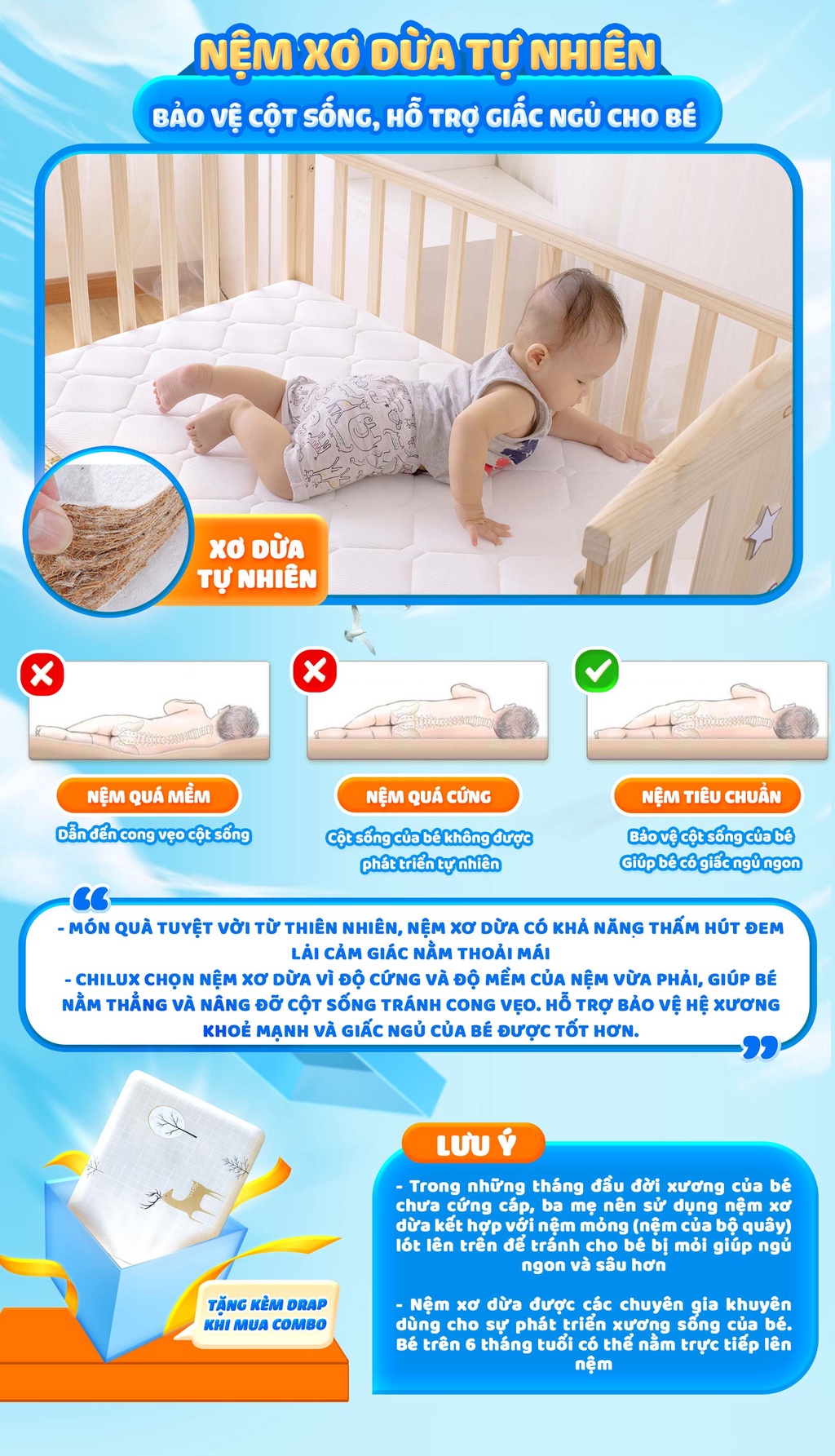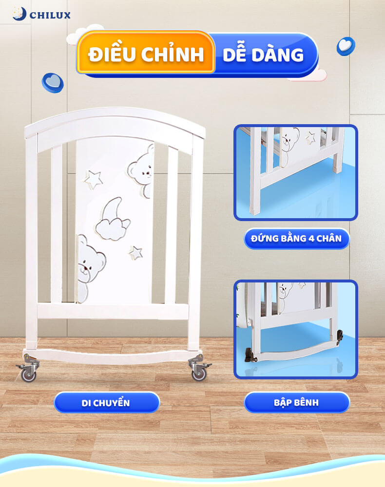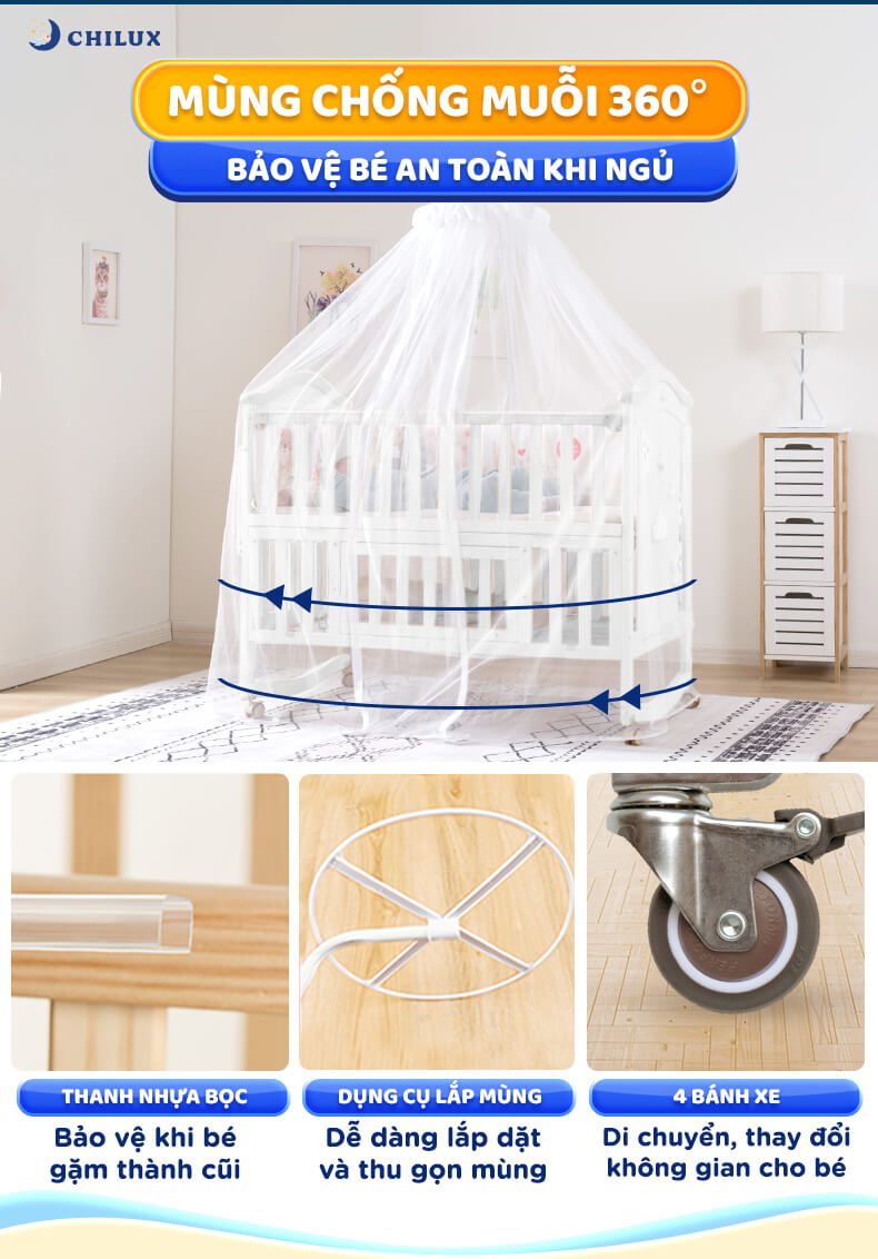 * Nôi cho bé Chilux được thiết kế theo tiêu chuẩn Châu Âu, đảm bảo an toàn về các thông số như khoảng cách các khung cũi 5.5cm tránh trường hợp bé bị kẹt tay, độ tiện lợi khi có thể linh hoạt biến thành giường ngủ, bàn học, nôi bập bênh.