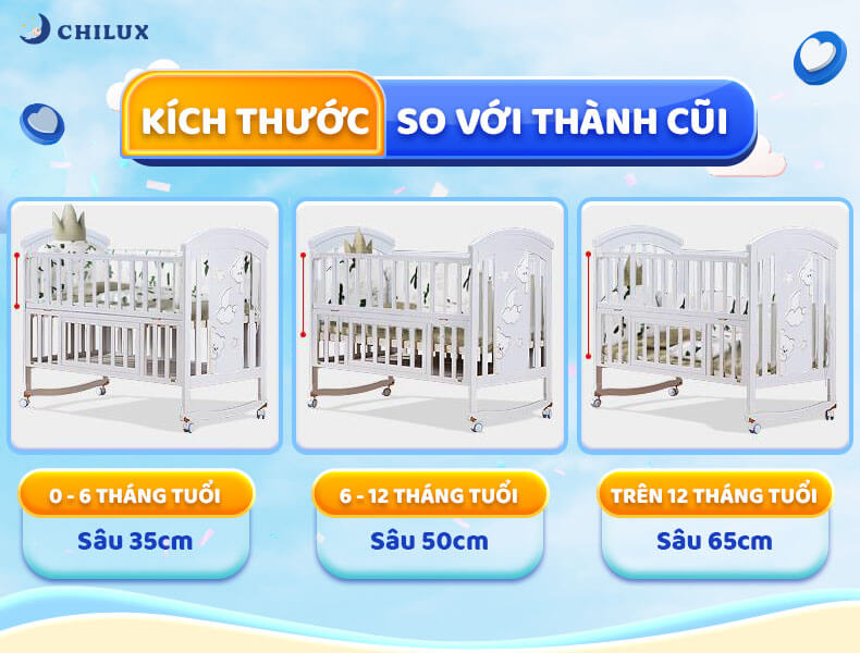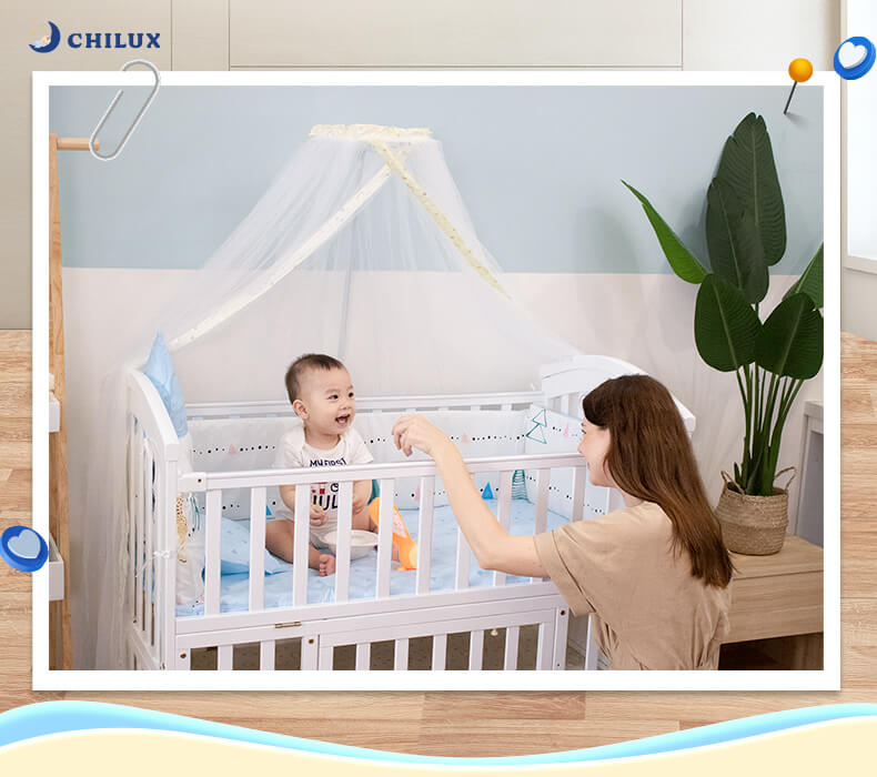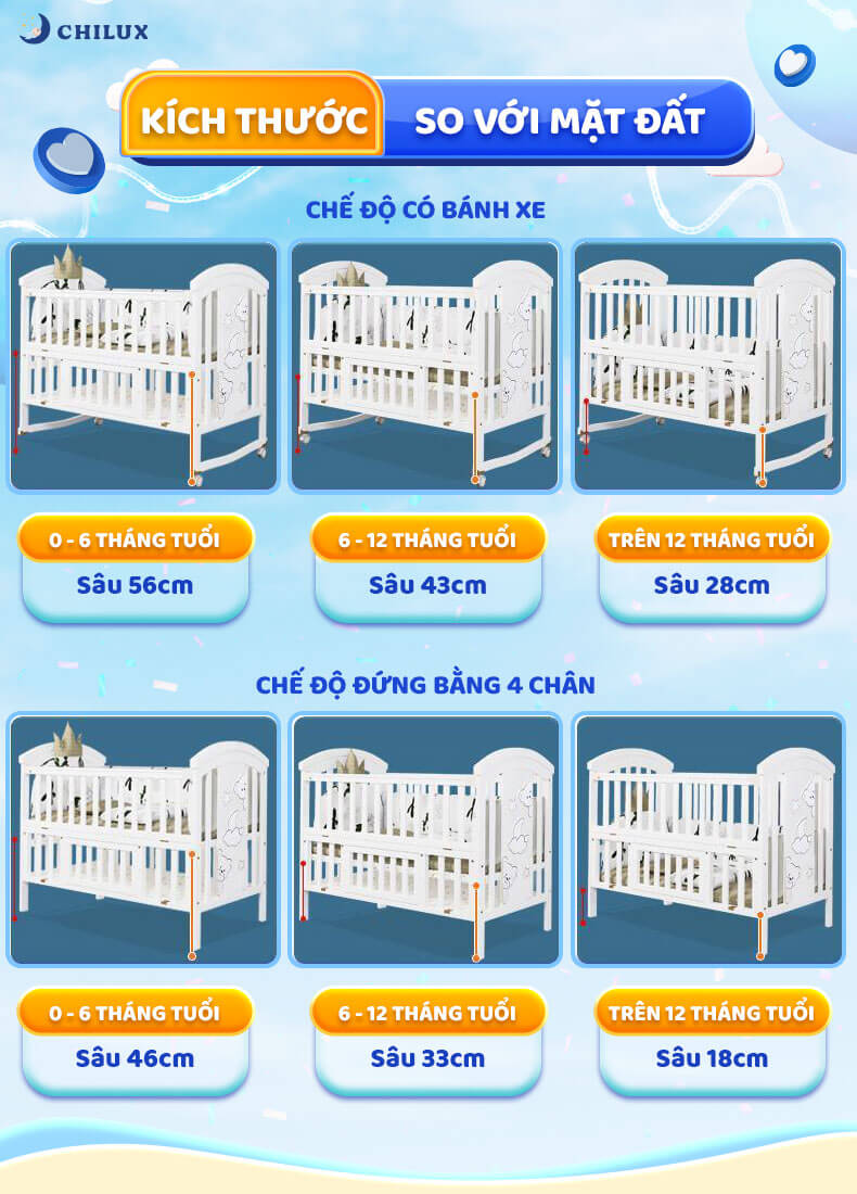 * Nôi cho bé Chilux được thiết kế theo tiêu chuẩn Châu Âu, đảm bảo an toàn về các thông số như khoảng cách các khung cũi 5.5cm tránh trường hợp bé bị kẹt tay, độ tiện lợi khi có thể linh hoạt biến thành giường ngủ, bàn học, nôi bập bênh.