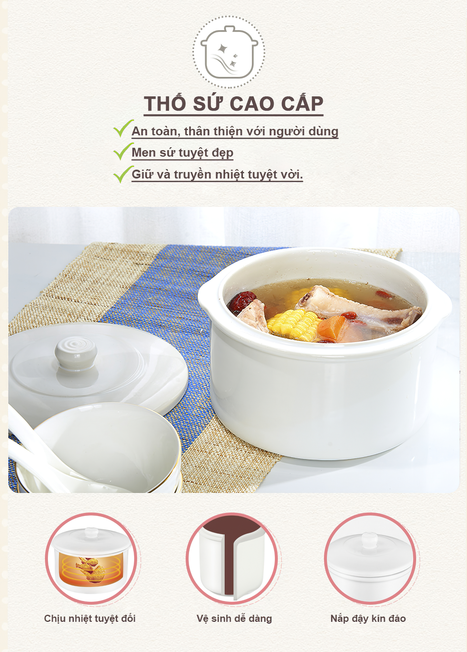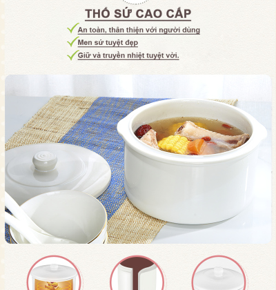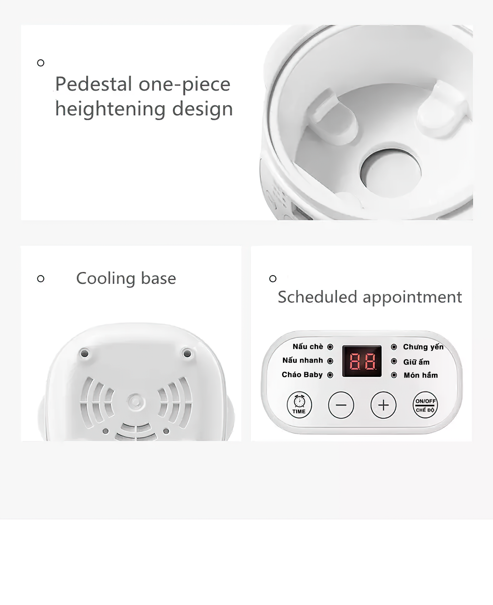 Các chế độ : tráng miệng (nấu súp, nấu chè ) ,nấu nhanh, cháo dinh dưỡng,tổ yến, giữ ấm,món hầm![]()
