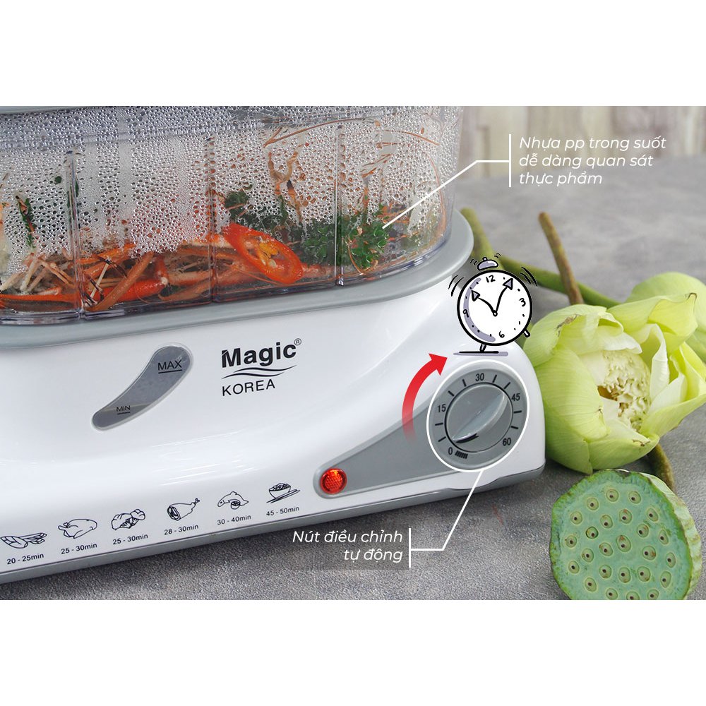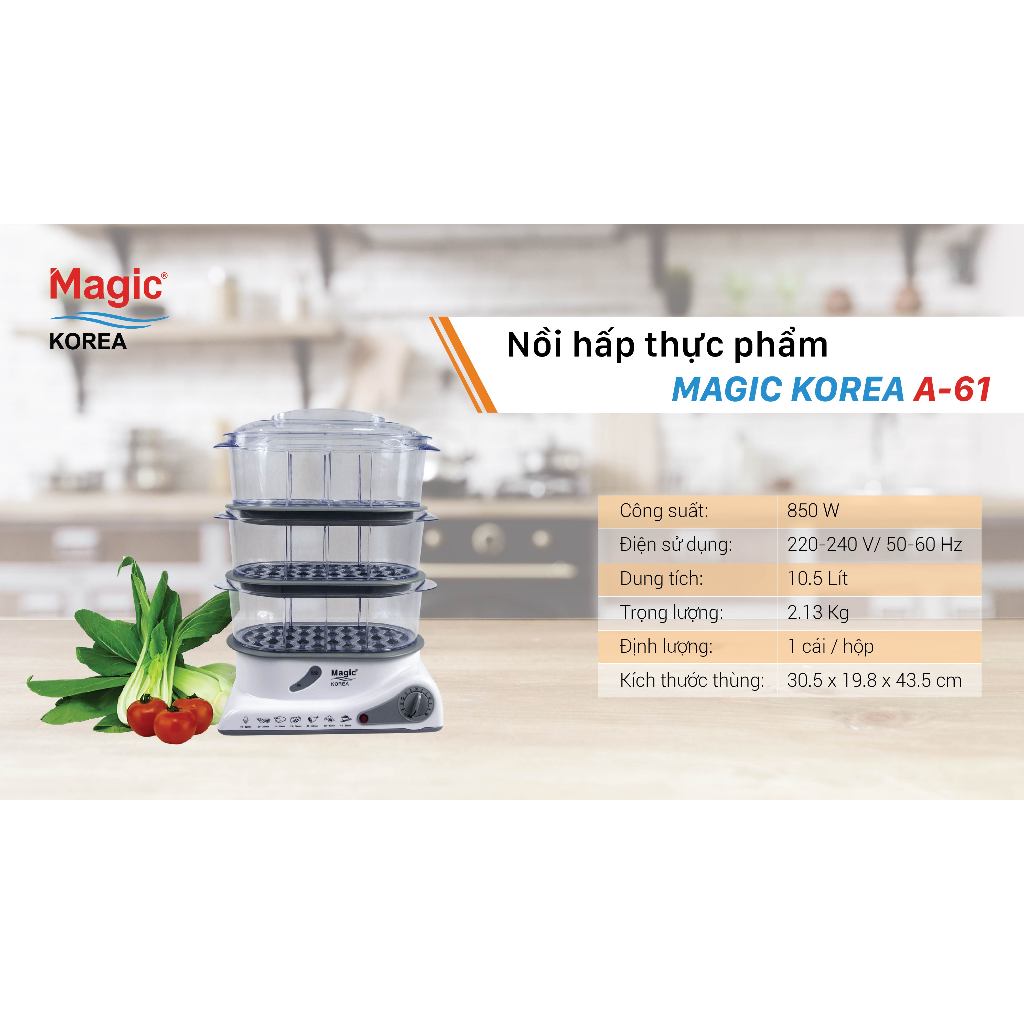 Máy hấp thực phẩm 3 tầng 10 lít Magic Korea A-61 850W, Hàng Chính Hãng, Lồng Hấp Nhựa PP Cao Cấp