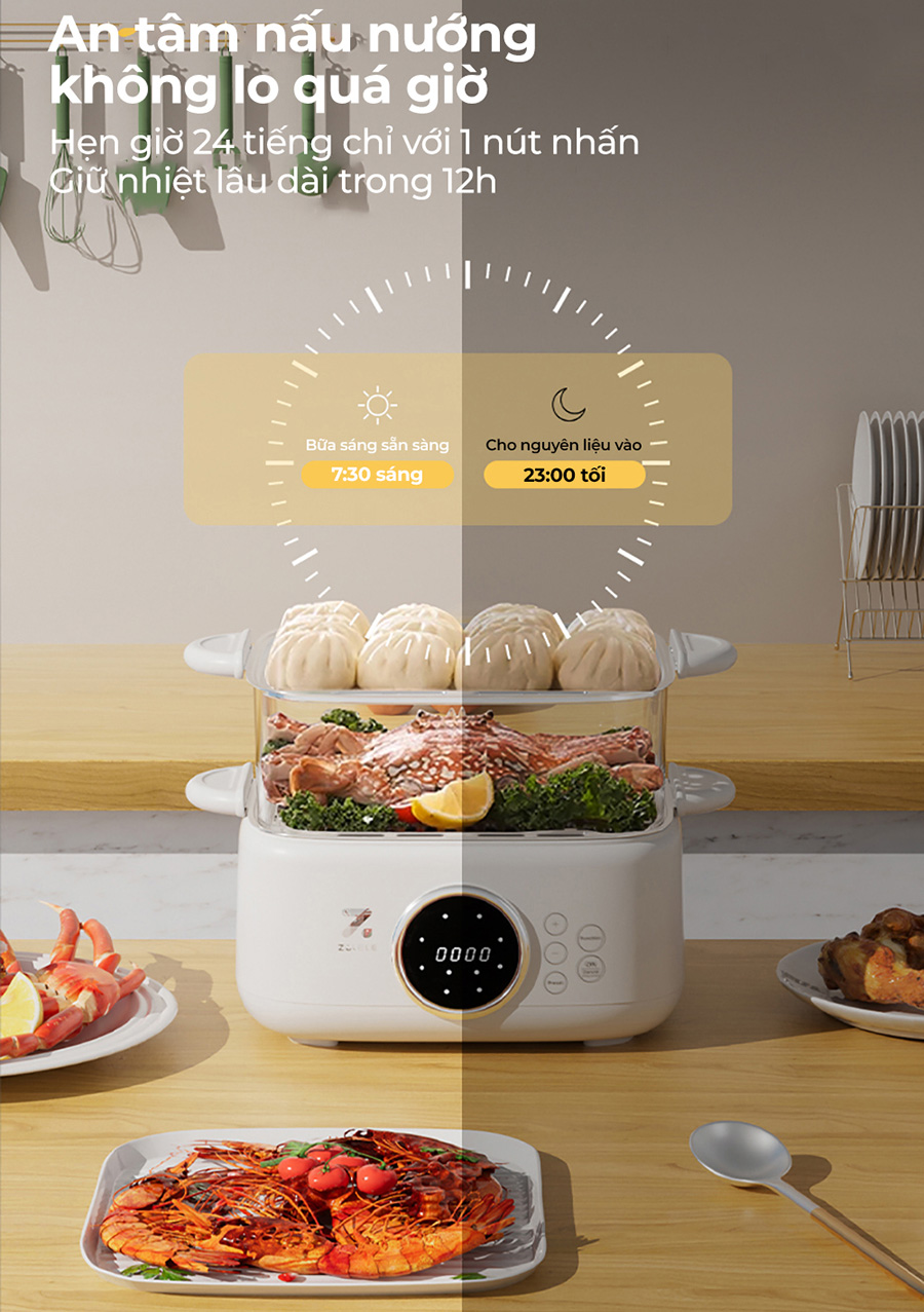 Theo đó, chức năng này cho phép người dùng hẹn giờ để nấu ăn, bạn có thể hẹn giờ từ tối để sáng hôm sau có được bữa sáng dinh dưỡng và thơm ngon cho gia đình mà không cần phải thức dậy sớm. Ngoài ra, nồi hấp còn sở hữu khả năng giữ nhiệt hiệu quả, đảm bảo đồ ăn luôn được giữ ấm trong 12 tiếng sau khi hoàn tất chương trình nấu.