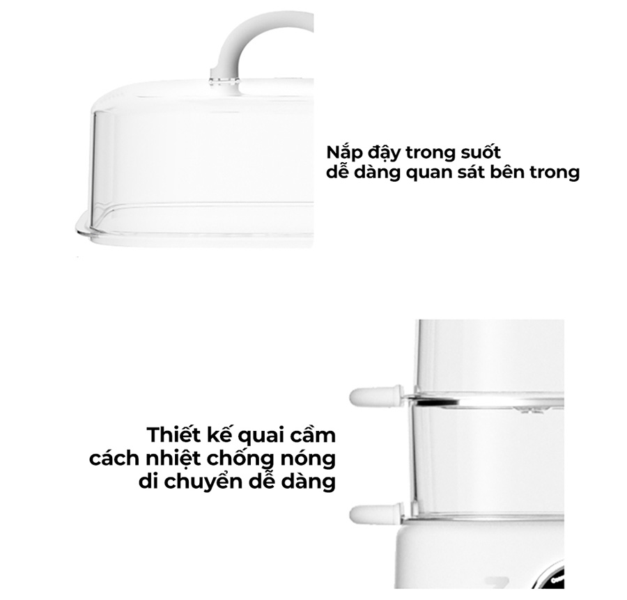 Chức năng hẹn giờ thông minh: Cho phép bạn đặt thời gian hấp chính xác, giúp đảm bảo thực phẩm được nấu chín đều và giữ nguyên hương vị tự nhiên.