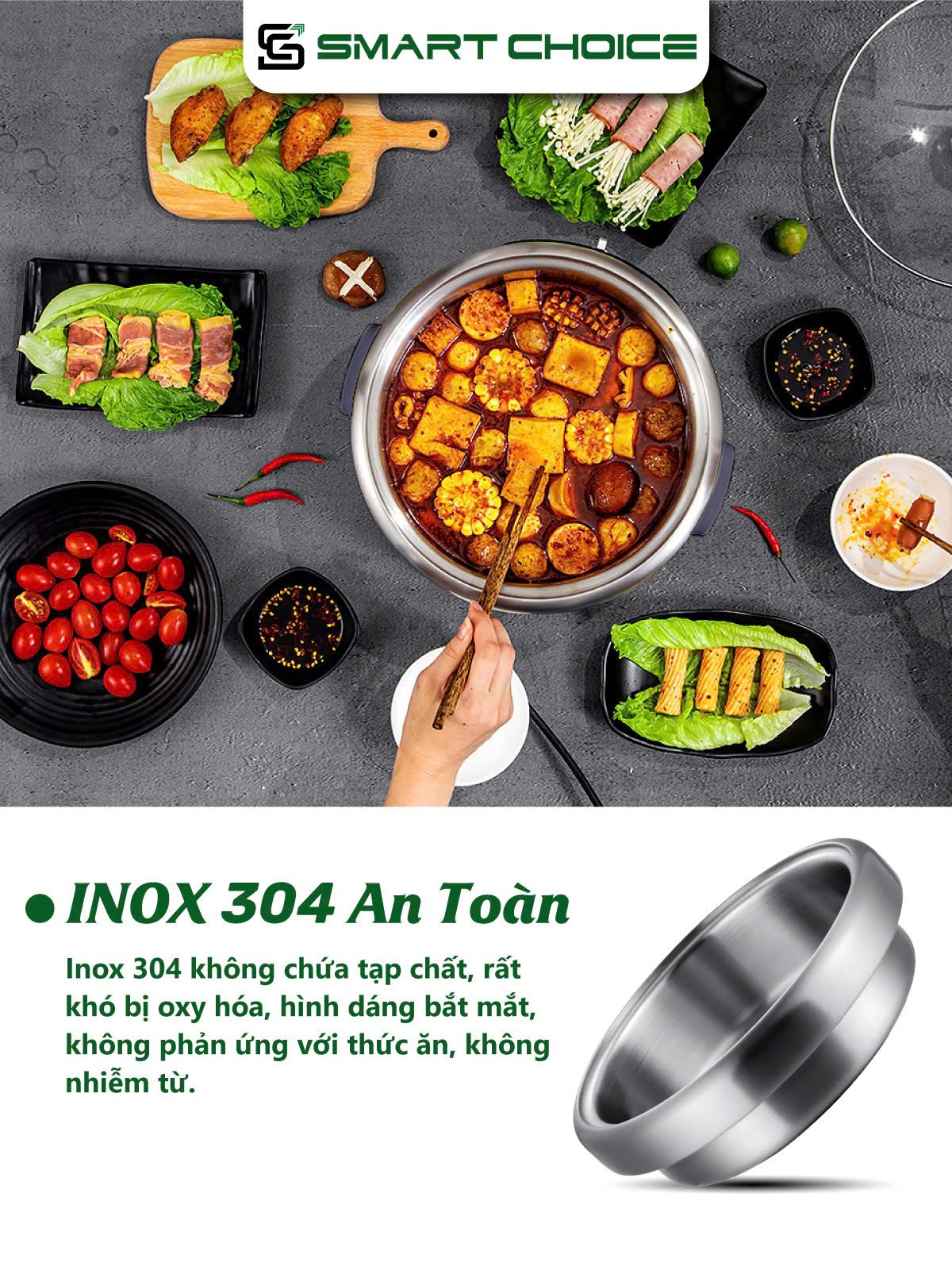 Nồi lẩu Smartchoice LND002 được làm từ inox 304, loại thép không gỉ cao cấp nhất, đảm bảo an toàn tuyệt đối cho sức khỏe người dùng. Chất liệu inox 304 không chỉ bền bỉ, chịu nhiệt tốt mà còn kháng ăn mòn, chống gỉ sét, giữ cho nồi luôn sáng bóng và bền đẹp theo thời gian. Đặc biệt, với inox 304, bạn hoàn toàn yên tâm khi chế biến thực phẩm mà không lo lắng về việc thôi nhiễm kim loại độc hại.