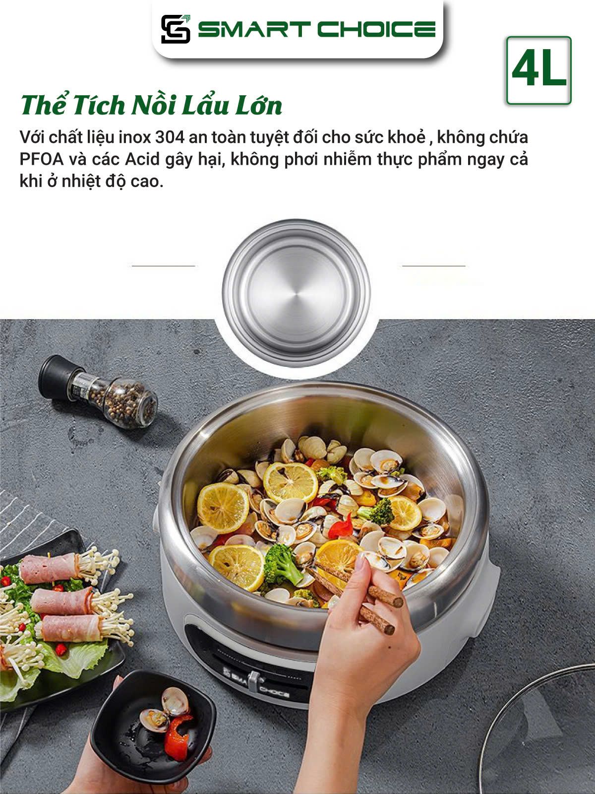 Với nồi lẩu Smartchoice LND002, bạn không cần phải chuẩn bị nhiều dụng cụ khi nấu ăn. Chỉ với một sản phẩm, bạn có thể làm ra các món lẩu ngon và nướng hấp dẫn, thích hợp cho các bữa ăn gia đình, tiệc cuối tuần hay các buổi tụ họp bạn bè.