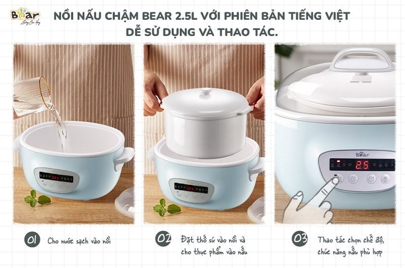 Quy trình sử dụng nồi nấu cháo chậm Bear bao gồm 3 bước: