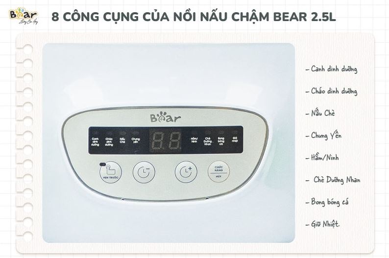 - 8 chế độ: Canh dinh dưỡng, cháo dinh dưỡng, cháo, đồ ngọt, tổ yến, bong bóng cá, nhựa đào, giữ ấm