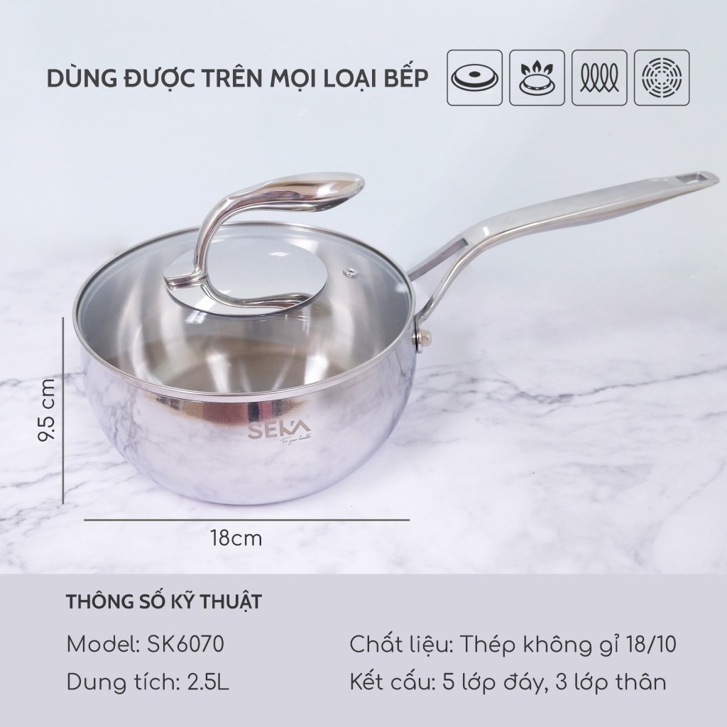 - Nồi inox nguyên khối 5 đấy từ Seka SK6070 sử dụng trên mọi loại bếp: Bếp từ, bếp điện, bếp ga, bếp hồng ngoại ...