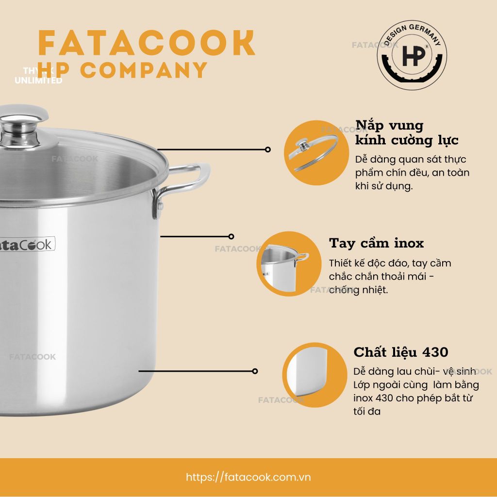 Nồi súp - Nồi luộc gà inox bếp từ Fatacook nắp kính đủ 3 size dùng được trên mọi loại bếp