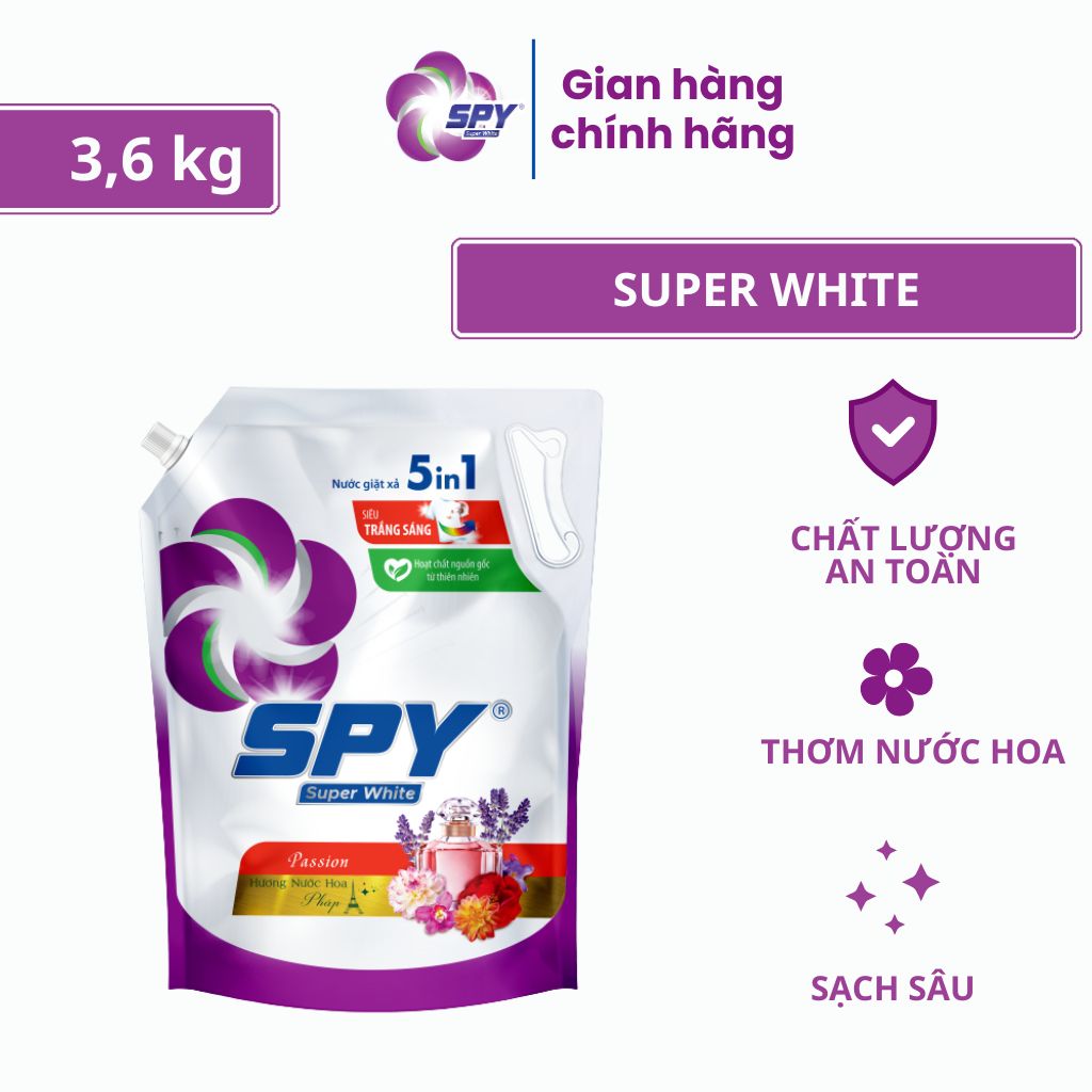 1. Tên Sản Phẩm: Nước Giặt Xả SPY Super White Túi 3,6kg 5 Trong 1 Siêu Trắng Sáng, Nước Giặt Sạch Sáng Thơm Lâu