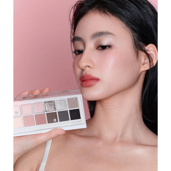 Bảng Phấn Mắt Ngọc Trai 12 Ô: Với sự kết hợp giữa 2 tone hồng lạnh và xám khói, kết hợp phấn lì và nhũ lấp lánh, bảng mắt là lựa chọn hoàn hảo cho makeup look hàng ngày lẫn đi tiệc.