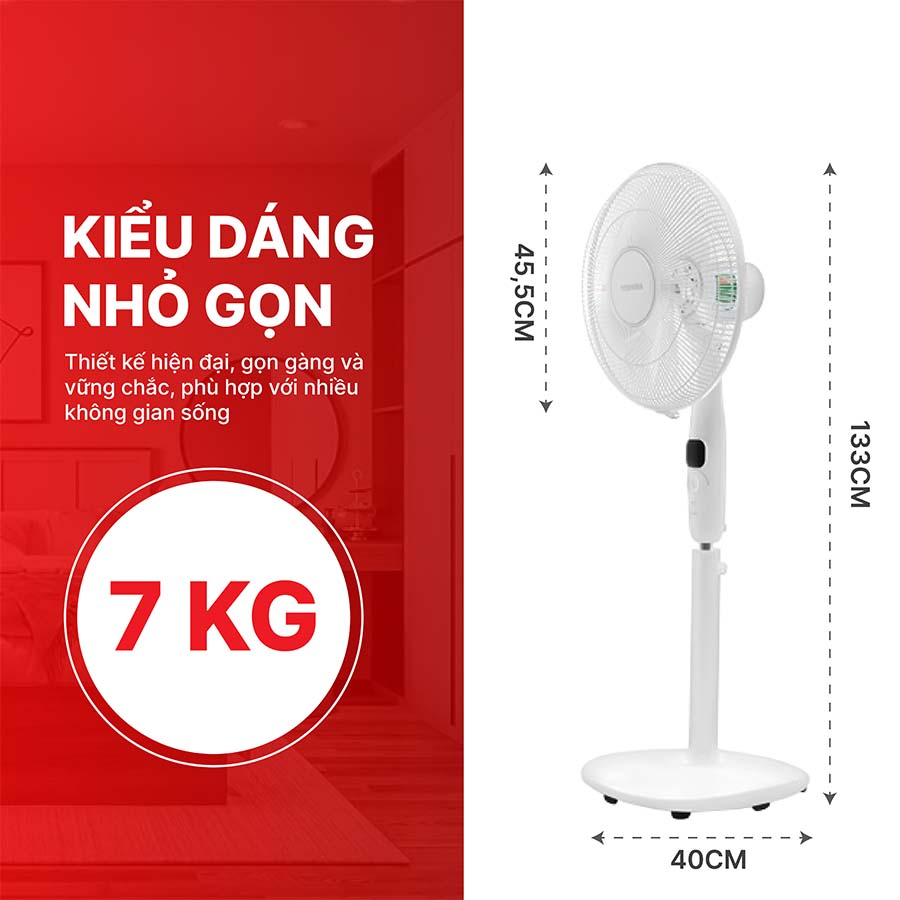 Với kích thước khoảng 45,5 × 40 × 133 cm và trọng lượng khoảng 7 kg, sản phẩm mang đến sự chắc chắn nhưng vẫn dễ dàng di chuyển giữa các không gian. Thiết kế hiện đại, tính năng đa dạng và công nghệ tiết kiệm điện khiến Toshiba F-LSD10(W)VN trở thành một trong những mẫu quạt cây đáng sở hữu nhất hiện nay, đáp ứng đầy đủ tiêu chí tiện nghi, tiết kiệm và bền bỉ cho gia đình Việt.