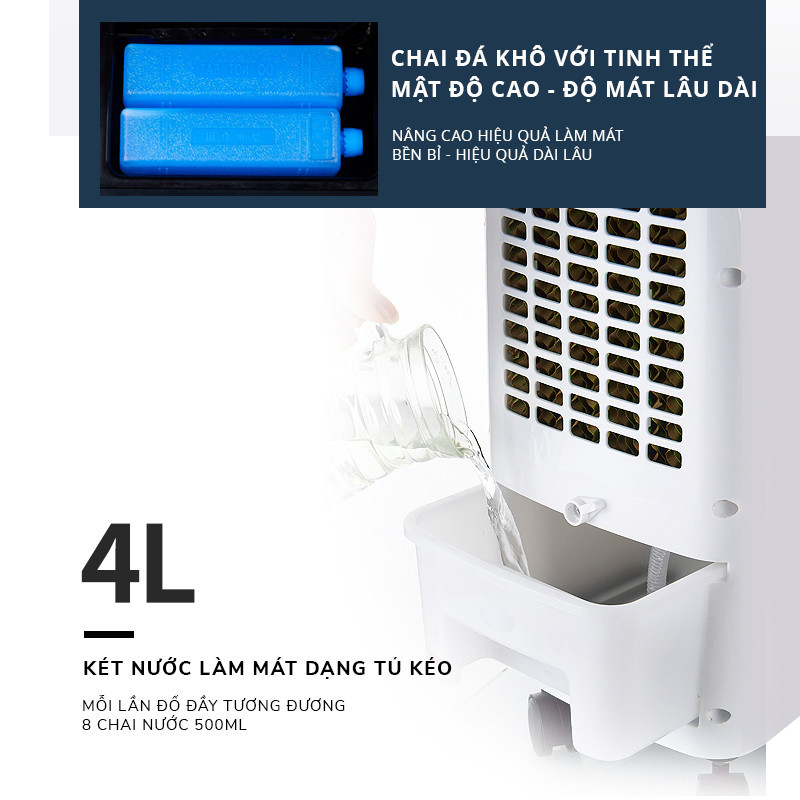 - Quạt hơi nước đem lại làn gió trong lành, tăng cường độ ẩm giúp hạ nhiệt đến 10 độ so với môi trường.