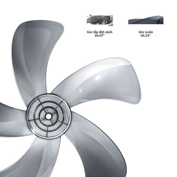 Hiệu suất làm mát vượt trội Được trang bị công suất 55W cùng động cơ bạc đạn bền bỉ, quạt hoạt động mạnh mẽ, ổn định và êm ái. Thiết kế 5 cánh quạt lớn kết hợp lồng quạt Airboost giúp luồng gió thổi xa đến 12m, làm mát hiệu quả ngay cả trong không gian rộng.