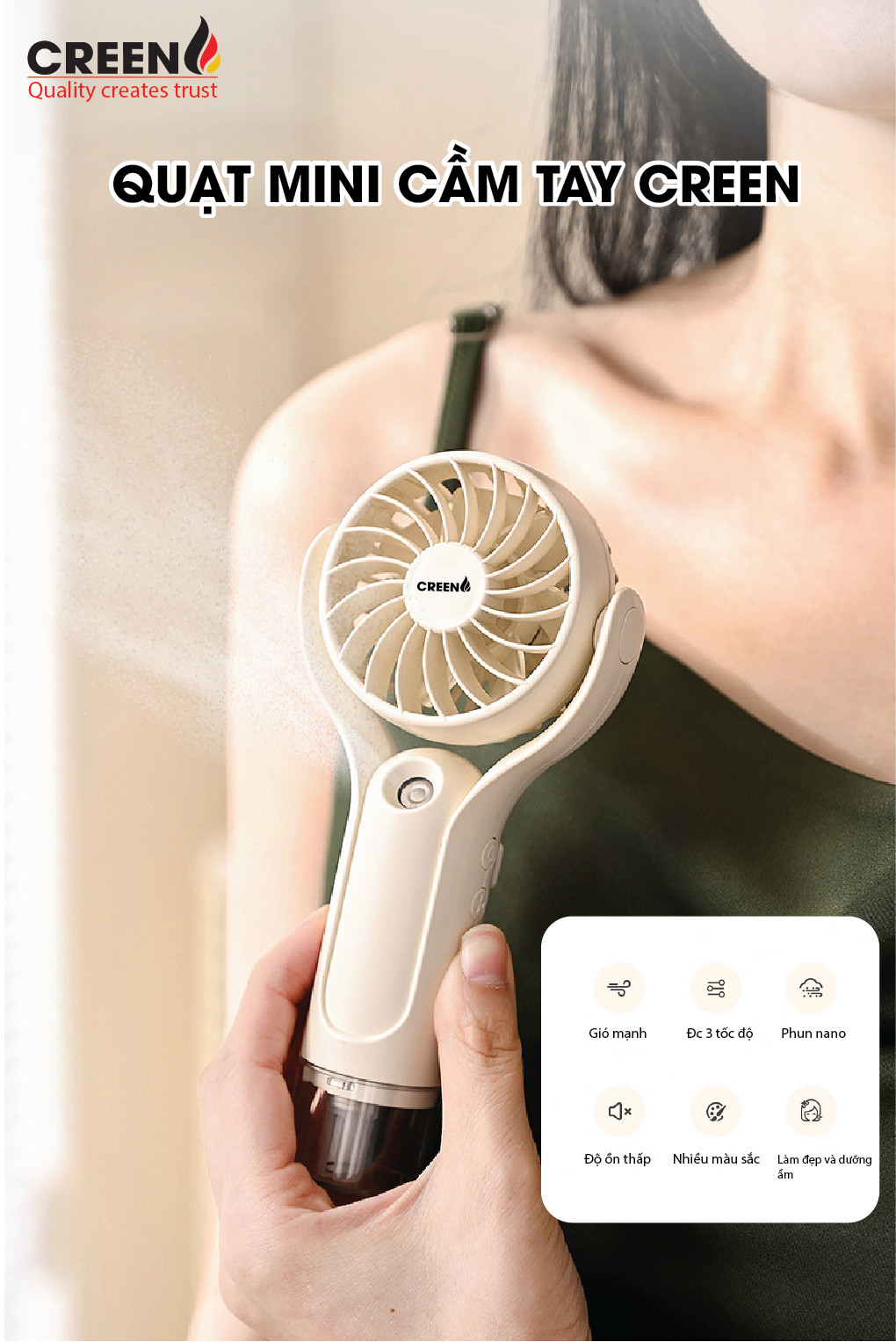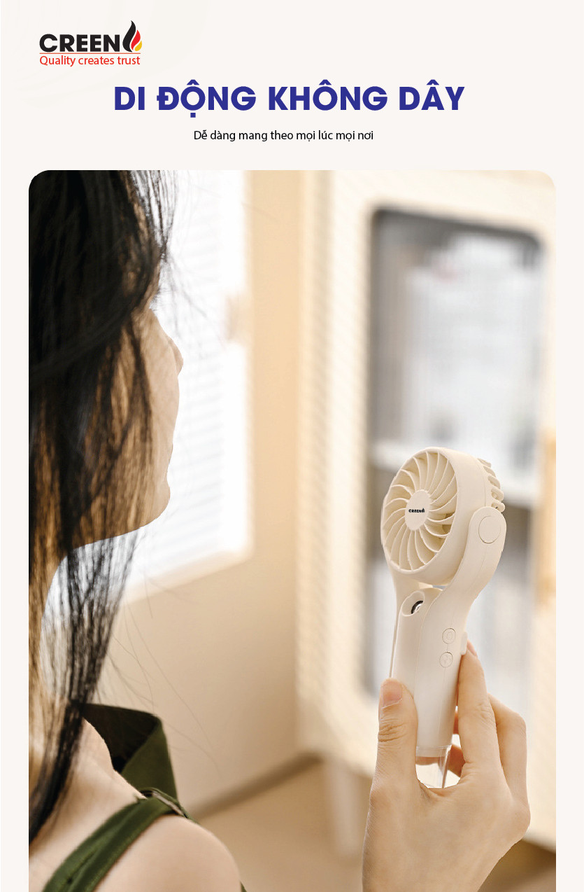 Quạt phun sương mini cầm tay Creen H20 với thiết kế nhỏ gọn hiện đại, dễ dàng mang theo mọi lúc mọi nơi, với chế độ phun sương Nano, dưỡng ẩm thân thiện với da không bị khô da do điều hòa với bình chứa nước lớn tiện lợi và tiết kiệm