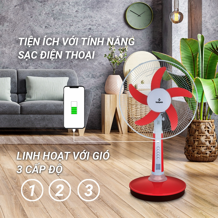 Quạt sạc đầy trong 6 tiếng đồng hồ. Ngoài chân sạc theo quạt thì còn Pin của Quạt Sạc Kalpen còn đóng vai trò như một chiếc sạc dự phòng cho điện thoại, ipad....của bạn.