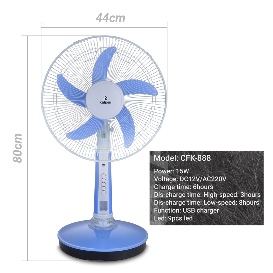 Thân cao lên tới 80cm, Lồng quạt có đường kính 44cm. Có 3 nút tốc độ quạt tiêu chuẩn và có thêm một Đèn LED 9pcs.