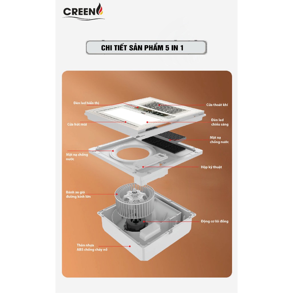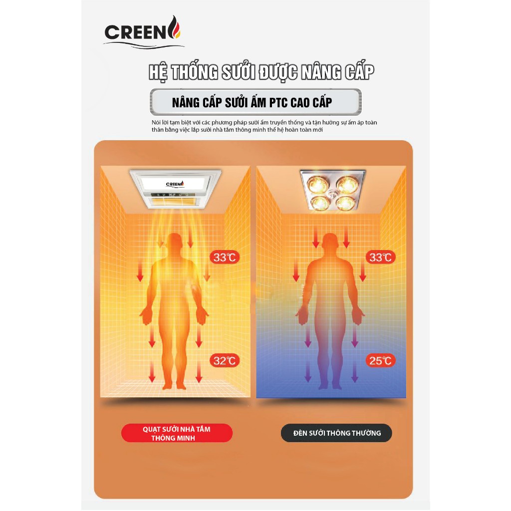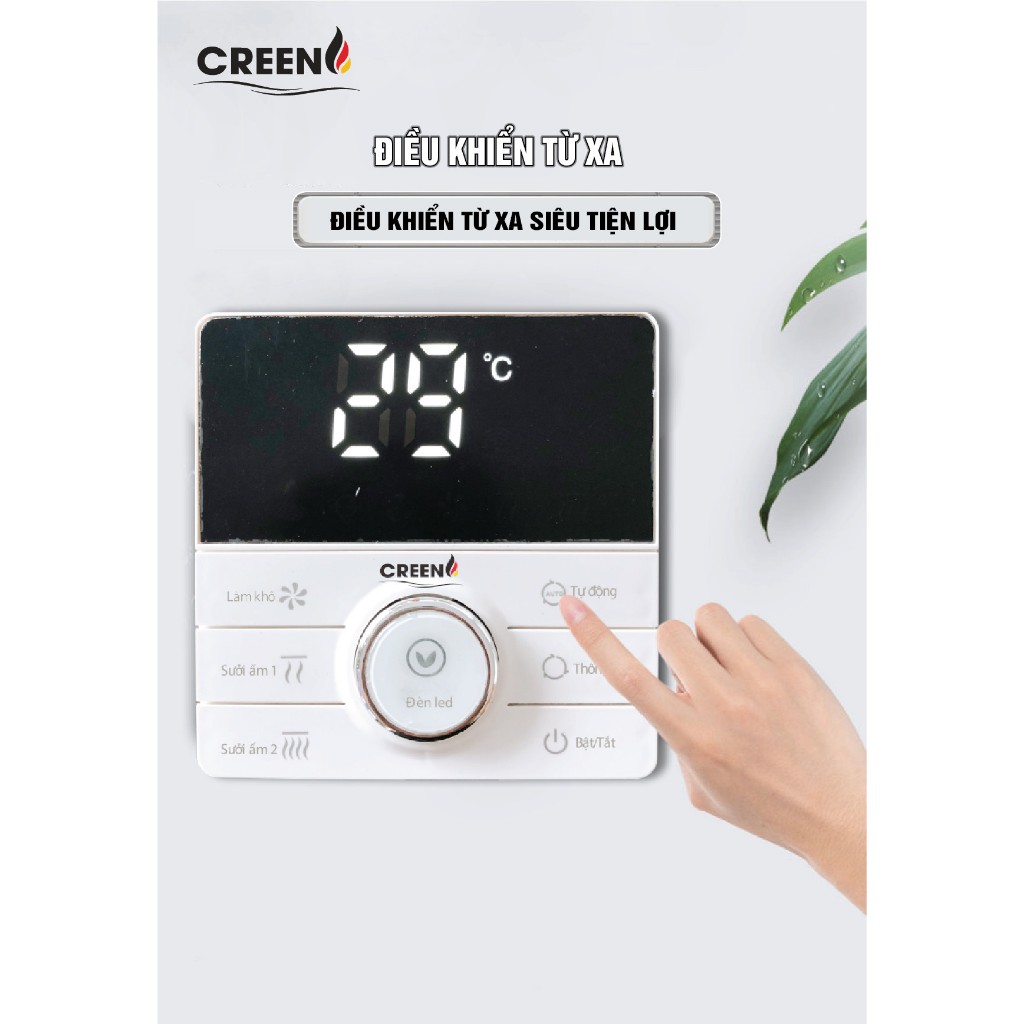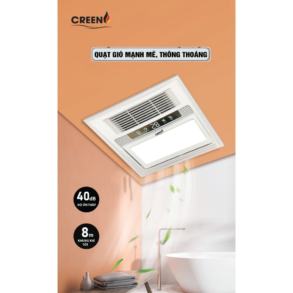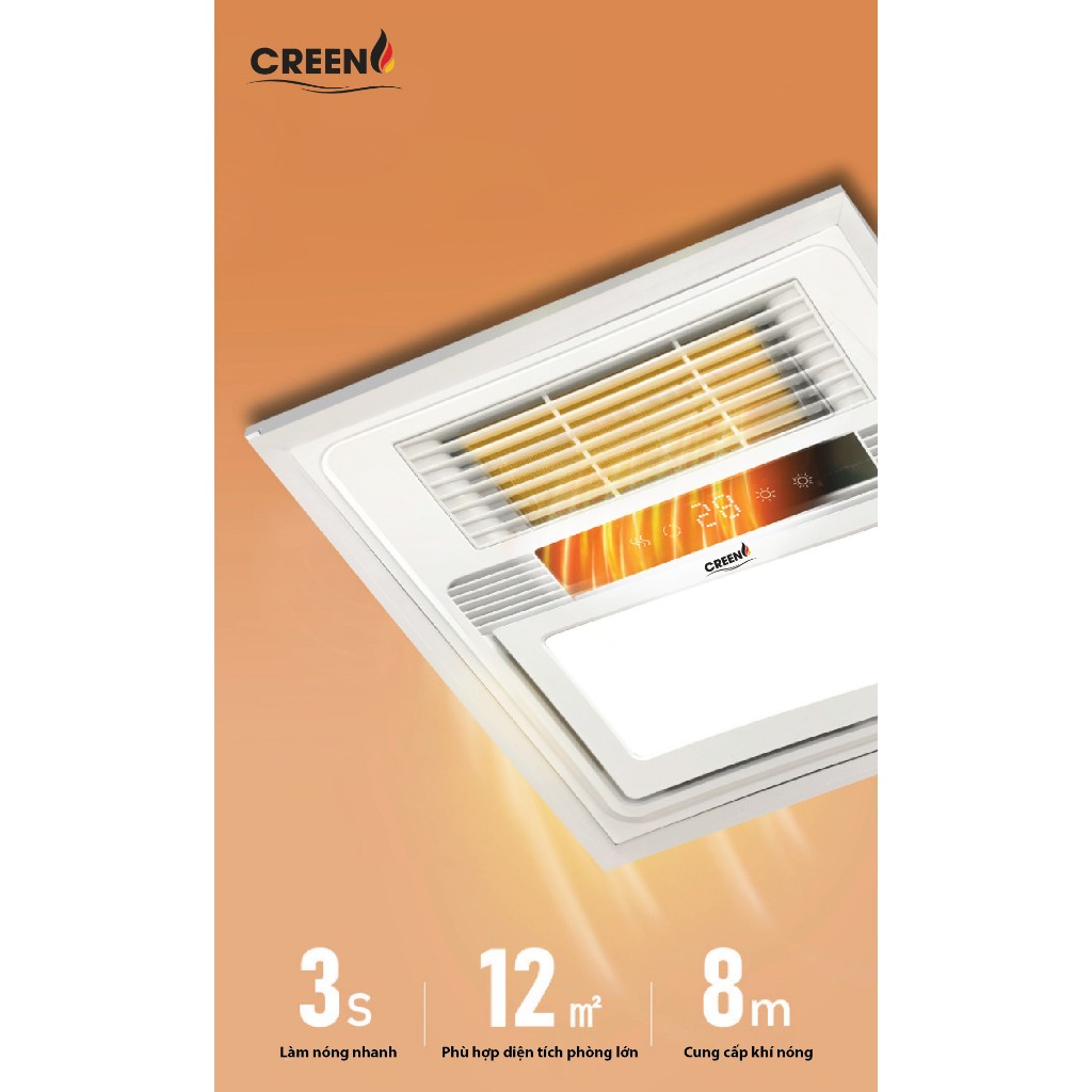 Quạt sưởi Creen có tổng công suất 2.600W, trong đó công suất đèn led chiếu sáng là 12W, được gia cố thêm silicone ngăn ngừa ẩm xâm nhập. Công suất quạt mát/thông gió là 35W.