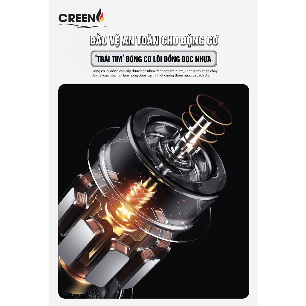 Động cơ lõi kép quấn dây đồng siêu bền, vận hành êm ái, chống han gỉ.