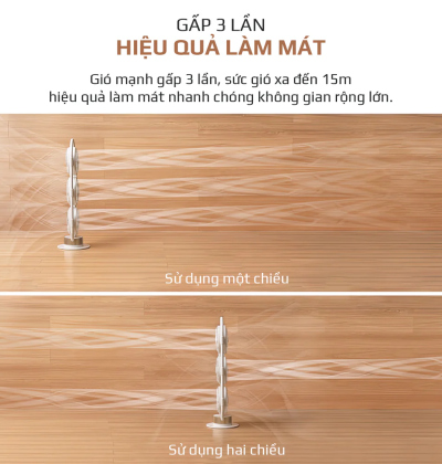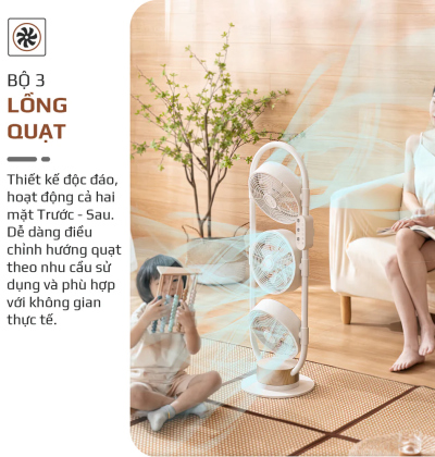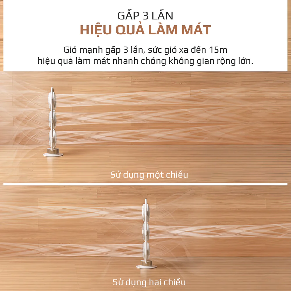 Hoạt động dựa trên nguyên lý tuần hoàn khí, tạo ra dòng gió xoáy đa chiều mạnh mẽ giúp không khí trong phòng được phân bổ đồng đều, loại bỏ cảm giác bí bách và chênh lệch nhiệt độ.