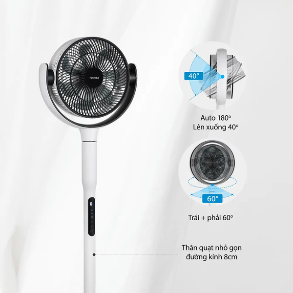 Quạt tuần hoàn Toshiba F-DSC40XVN(W) sở hữu gam màu trắng tinh tế, kiểu dáng thanh lịch phù hợp với nhiều không gian sống từ phòng khách, phòng ngủ đến văn phòng. Chiều cao 117,5 cm và thân quạt chắc chắn giúp sản phẩm vừa gọn gàng vừa dễ bố trí.