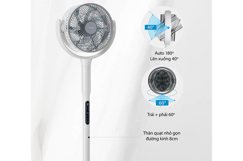 Toshiba F-DSC70XVN(W) sở hữu kiểu dáng thanh lịch với gam màu trắng tinh tế, phù hợp với nhiều không gian sống như phòng khách, phòng ngủ hay văn phòng. Chiều cao khoảng 117,5 cm giúp luồng gió lan tỏa rộng rãi, bao phủ toàn bộ căn phòng.