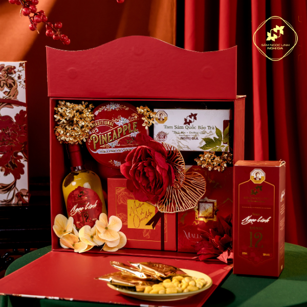 01 Chai Rượu Ngọc Linh đỉnh 12 (375ml), 01 Hộp Tam Sâm Quốc Bảo Trà, 01 Hộp Bánh Pineapple, 01 Hộp Socola Maison, 01 Hộp Cafe Mallorie