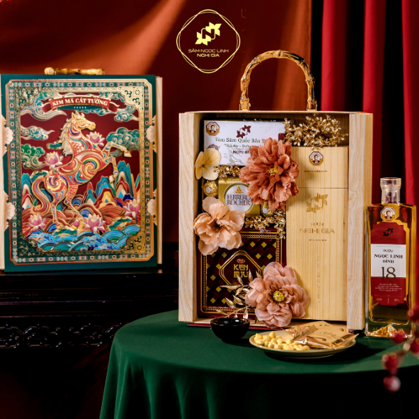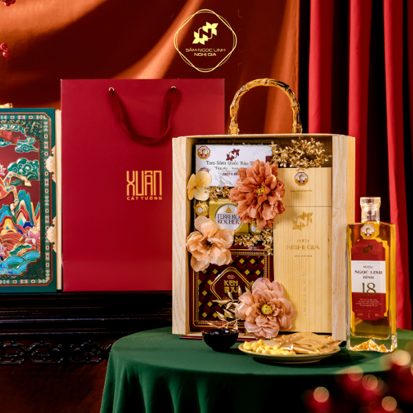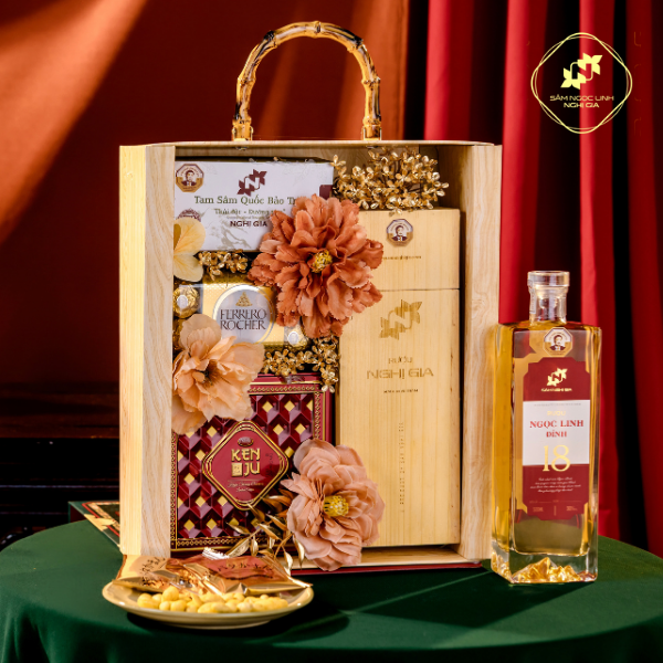 Rượu Ngọc Linh Đỉnh 18 (500ml) là tâm điểm của hộp quà, rượu được chưng cất từ gạo Nhật Japonica, lên men men thuốc bắc theo công thức truyền thống, kết hợp cùng tinh chất Sâm Ngọc Linh để tạo nên hương vị êm mượt, hậu vị dài và giá trị bồi bổ sức khỏe. Bên cạnh đó là