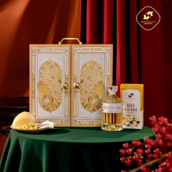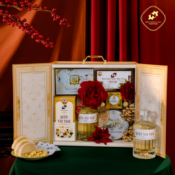 Rượu Sâm Ngọc Linh Japonica Vảy Vàng, dòng rượu thượng hạng của Nghị Gia được nấu từ gạo Nhật Japonica cho hậu vị êm dịu và mềm mại. Rượu được lên men theo bí quyết riêng, kết hợp cùng tinh chất Sâm Ngọc Linh – loại sâm quý hiếm bậc nhất Việt Nam với hàm lượng saponin cao, giúp bồi bổ sức khỏe và tăng cường sinh lực. Những vảy vàng 24K tinh khiết được dát mỏng trong từng chai rượu không chỉ tạo nên vẻ đẹp sang trọng, mà còn tượng trưng cho tài lộc thịnh vượng trong năm mới. Đi kèm là