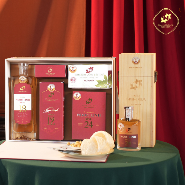- Rượu Ngọc Linh Đỉnh 24 (125ml): rượu được tinh chế từ sâm Ngọc Linh lâu năm, có hàm lượng saponin cao, vị thơm đặc trưng từ lá sâm ngọn linh.