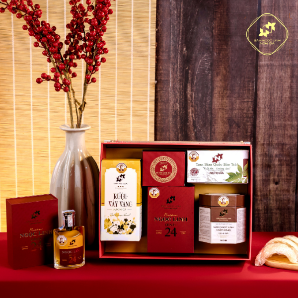 01 Sâm Ngọc Linh Mật Ong, 01 Rượu Ngọc Linh Đỉnh 24 - 125ml, 01 Cánh Yến Thượng Hạng, 01 Rượu Vảy Vàng Japonica - 500ml, 01 Tam Sâm Quốc Bảo Trà