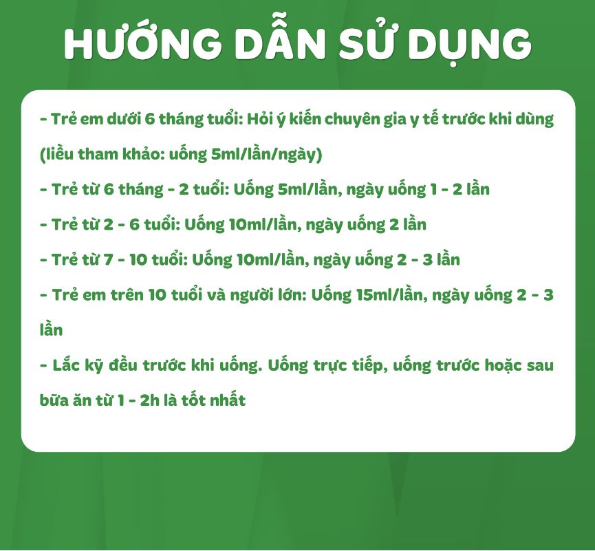 Trẻ từ 6 tháng - 2 tuổi: Uống 5ml/lần, ngày uống 1-2 lần.
