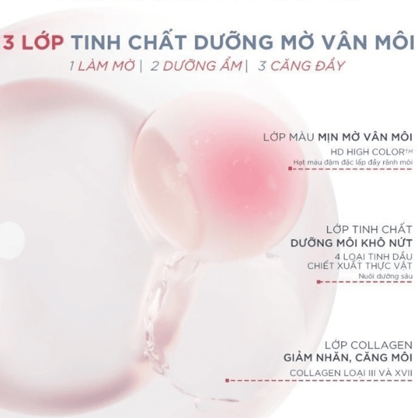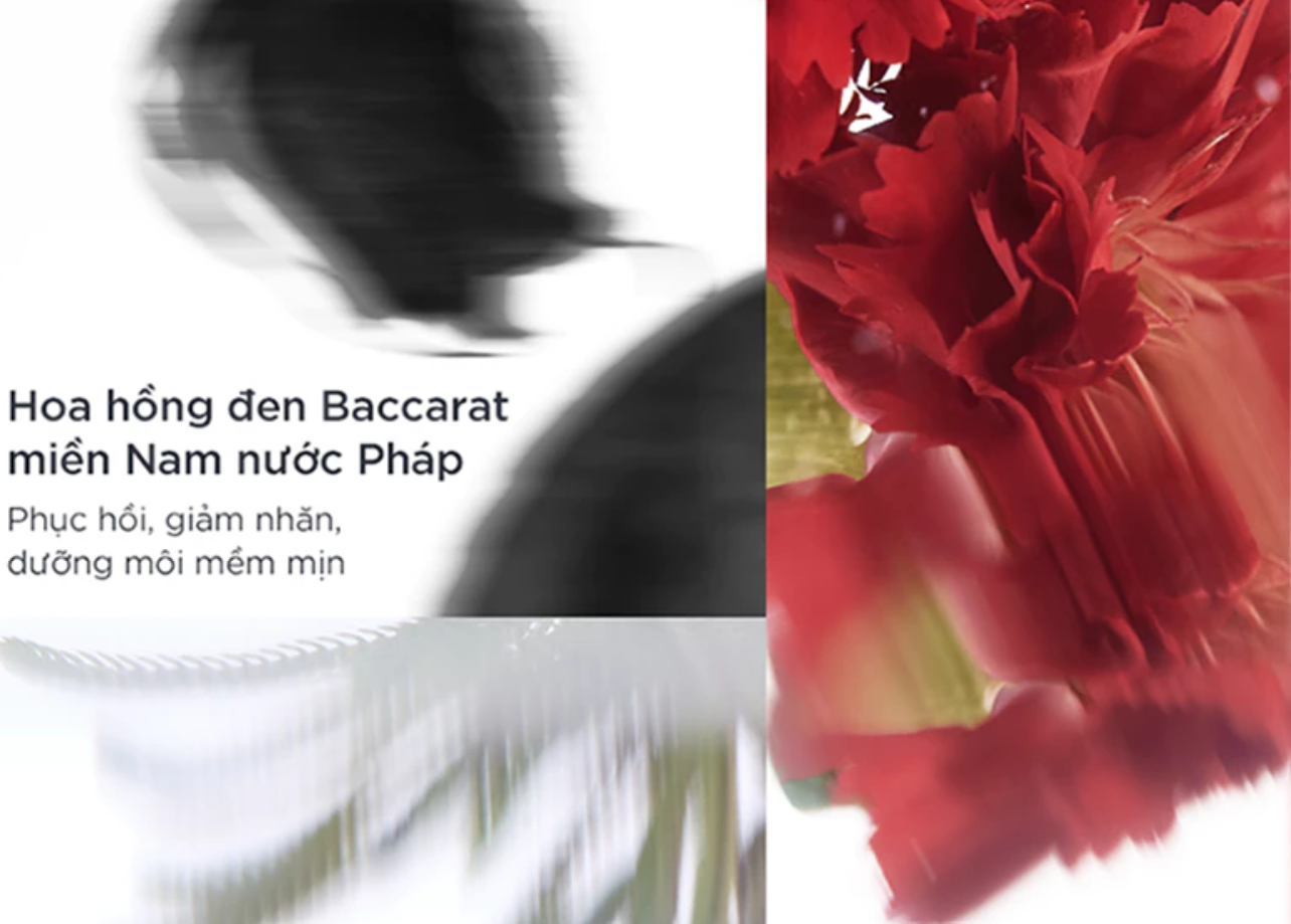 Sản phẩm nổi bật với đầu bi kim loại độc đáo (đầu sắt mát lạnh), lăn nhẹ trên môi tạo cảm giác sảng khoái, dễ chịu như massage spa mini – tán đều son mà không cần cọ. Công thức watery lỏng nhẹ, chứa 90% tinh chất dưỡng thực vật: hoa hồng đen Baccarat Pháp (dưỡng hồng hào), hoa lựu (chống oxy hóa), dầu jojoba (cấp ẩm sâu), cỏ Phượng Hoàng Nam Phi (làm đầy rãnh môi). Kết quả? Đôi môi căng mọng, bóng gương tráng mịn chỉ sau 1 lần thoa. Hiệu ứng glow tự nhiên, không bết dính, không lem mép – lý tưởng cho makeup hàng ngày từ cà phê chill đến party đêm.