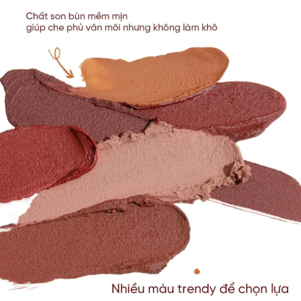 Thuong hieu JUDYDOLL duoc biet den voi cac san pham my pham an toan, gia ca phai chang va cong thuc tien tien. Son Kem Bun Matte Lip Mud duoc san xuat tu nguyen lieu cao cap, khong chua paraben hay chat gay hai, duoc kiem nghiem da lieu de dam bao an toan cho moi nhay cam. Cong thuc nang cap voi ket cau bun nhe, che phu day dac nhung khong gay kho moi, giup lam min van moi len den 68% nho hieu ung blurring. San pham co bang mau da dang, tu tong nude trung tinh nhu #101 Light Krissu, #102 Light Marilyn den cac sac do cam sac net nhu #103 Light Monte Orange, ton len ve dep da A Dong ma khong qua loe loet.