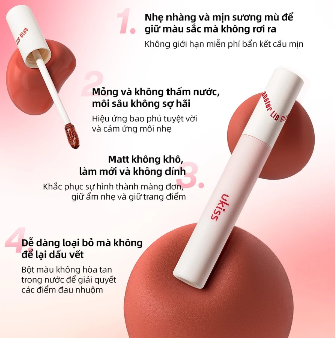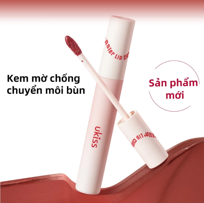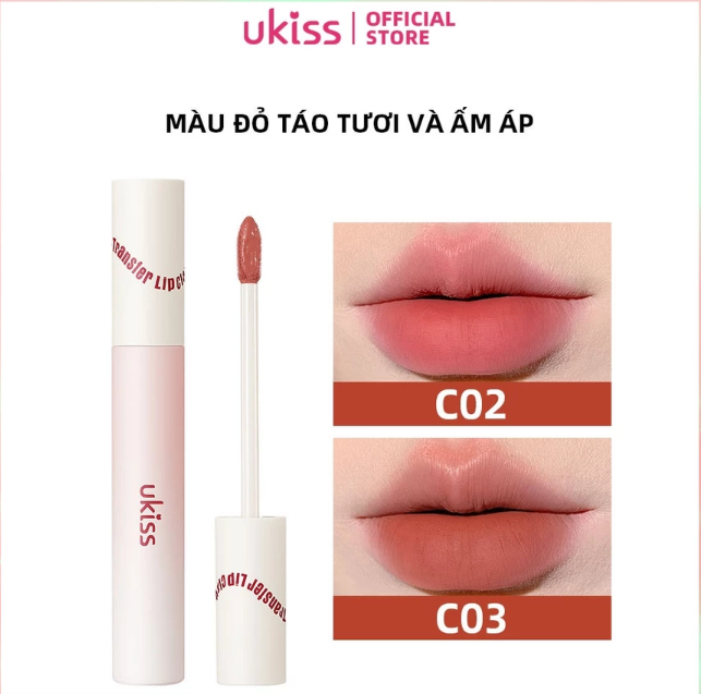 Son Kem Bùn Lâu Trôi Ukiss 3g mang tông đỏ gạch thời thượng, chất son kem bùn đặc mịn, khô lì sau 60 giây nhưng môi vẫn căng mọng nhờ dầu jojoba và vitamin C. Độ bám 12 giờ, ăn uống bình thường không lem.