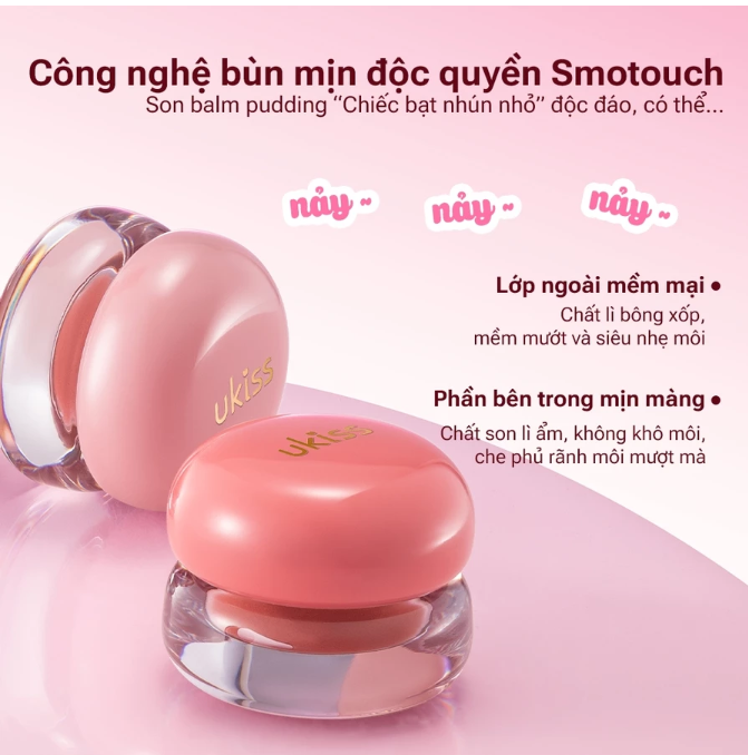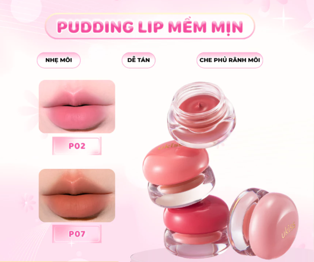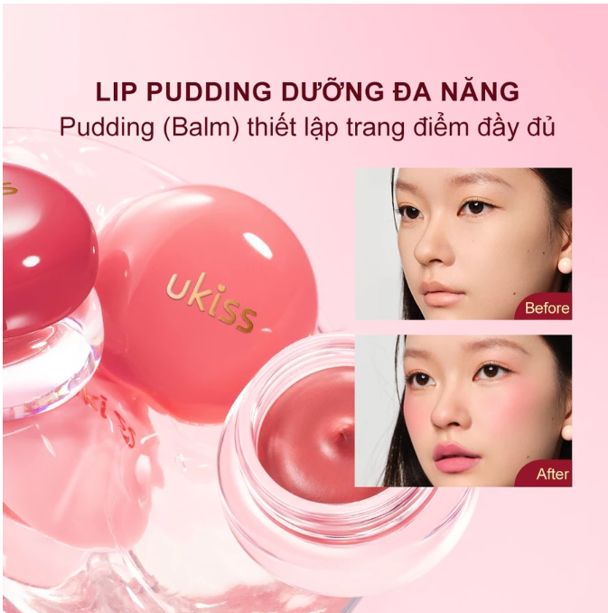 Ukiss Pudding Lip 4.2g là son kem đa năng dạng pudding mềm mịn, dùng được cho cả môi và má hồng chỉ trong 1 sản phẩm. Kết cấu tan nhẹ như thạch, thoa lên môi má đều mượt, không vón cục.
