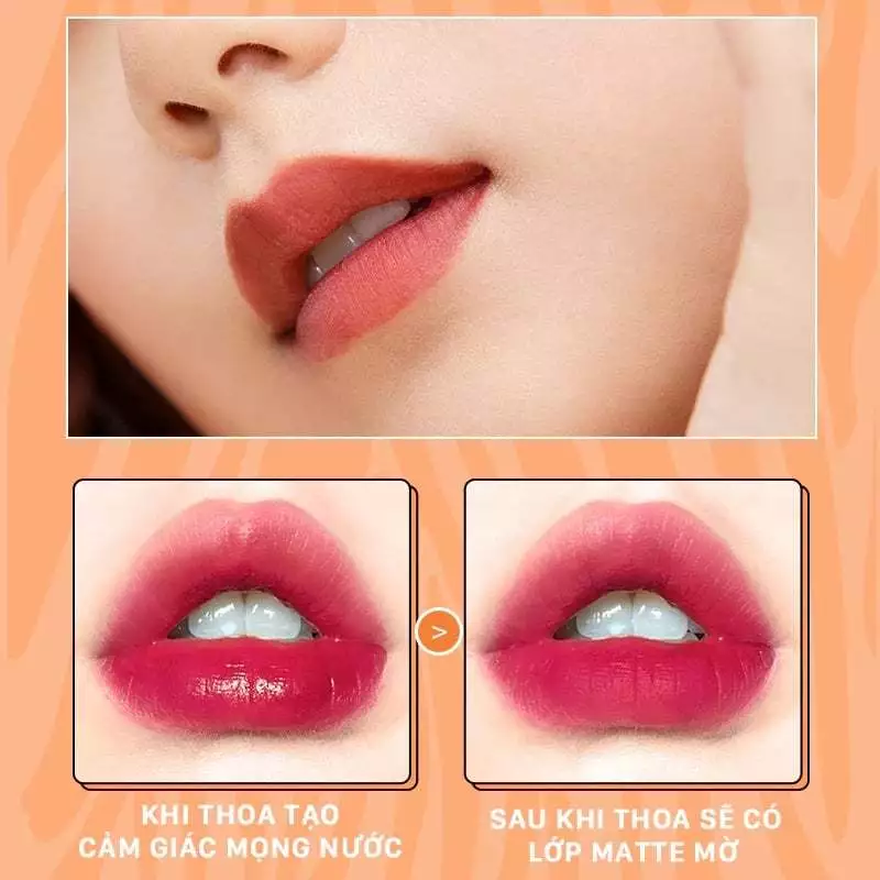 Màu cam đất chuẩn Ginger Cat tôn da sáng lẫn bánh mật, phù hợp makeup hàng ngày lẫn dự tiệc. Độ bám 8 giờ, ăn uống nhẹ không phai, không in dấu ly.