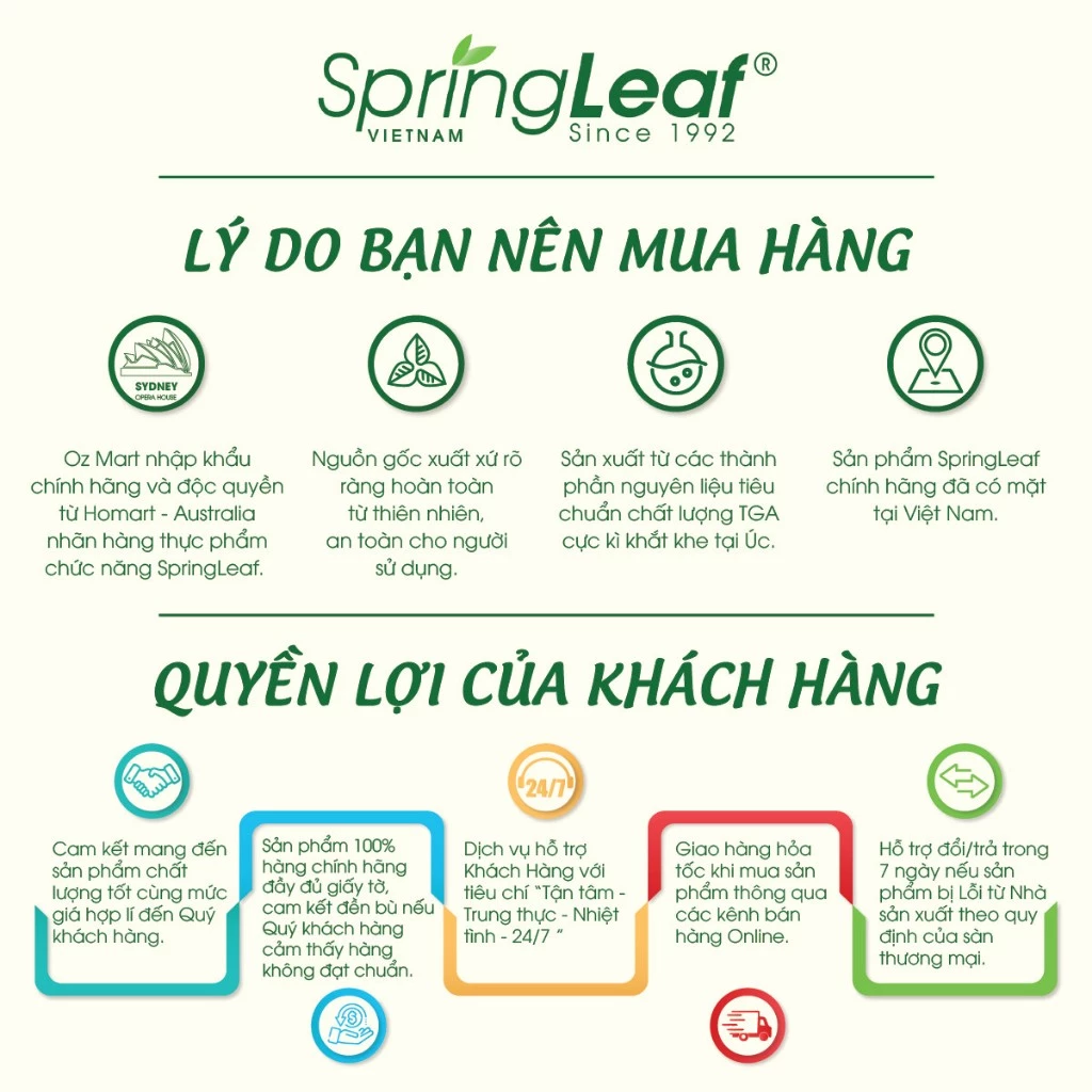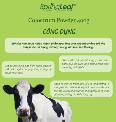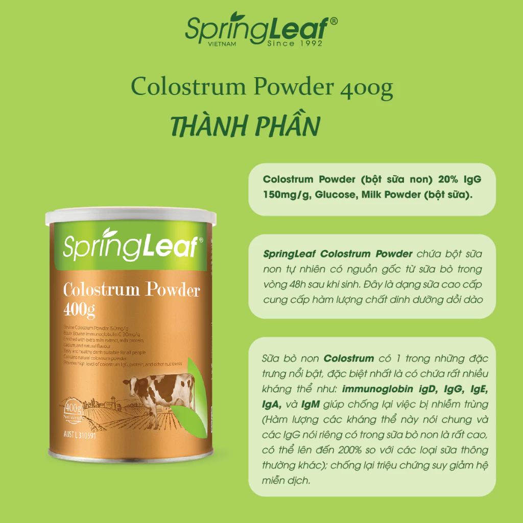 Bột Sữa Bò Non SpringLeaf Colostrum IgG 3000mg 400g là sản phẩm bổ dưỡng cao cấp nhập khẩu chính hãng từ Úc, được sản xuất bởi Homart Pharmaceuticals theo tiêu chuẩn chất lượng nghiêm ngặt. Đây là thức uống thơm ngon, lành mạnh, phù hợp cho mọi lứa tuổi, đặc biệt là trẻ em đang trong giai đoạn phát triển, người cao tuổi hoặc những người cần phục hồi sức khỏe. Sản phẩm cung cấp hàm lượng immunoglobulin (IgG) cao, các yếu tố tăng trưởng, protein và nhiều dưỡng chất thiết yếu, giúp tăng cường hệ miễn dịch và hỗ trợ sức khỏe tổng thể. Hãy để SpringLeaf Colostrum trở thành người bạn đồng hành cho sức khỏe của bạn và gia đình!