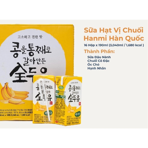 Sữa hạt vị chuối Hanmi là một sản phẩm dinh dưỡng tiện lợi, được ưa chuộng tại thị trường Hàn Quốc. Điểm nổi bật của sản phẩm này là sự kết hợp giữa các loại hạt bổ dưỡng và hương vị chuối tự nhiên.