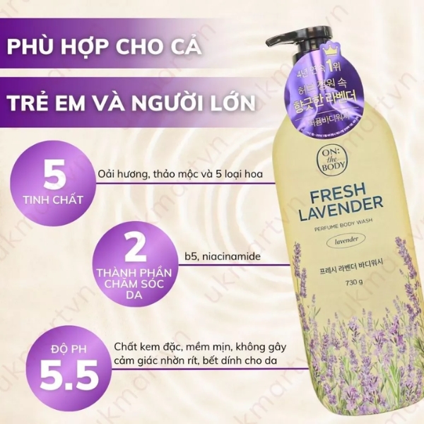Sữa tắm On The Body Perfume Body Wash Fresh Lavender 730g là một sản phẩm sữa tắm cao cấp từ Hàn Quốc, thuộc dòng "Perfume Body Wash" của thương hiệu On The Body, nổi bật với khả năng lưu hương như nước hoa và cung cấp độ ẩm vượt trội.